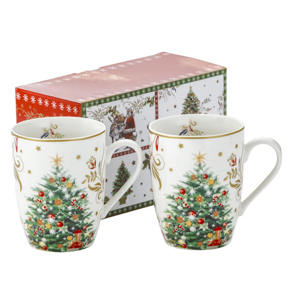 Zestaw 2 kubków świątecznych 360 ml – porcelana ozdobiona choinką i złotymi detalami