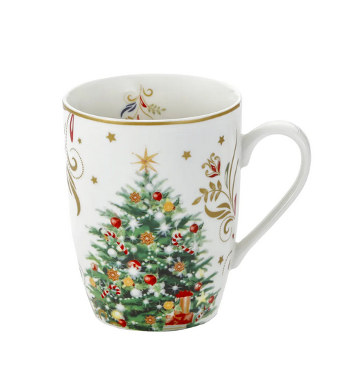 Wprowadź do swojego domu magię Świąt z wyjątkowym zestawem dwóch kubków o pojemności 360 ml, ozdobionych uroczym motywem bożonarodzeniowej choinki z kolorowymi bombkami, cukrowymi laskami i prezentami u jej stóp. Eleganckie wykończenie w postaci złotych gwiazdek i ornamentów nadaje kubkom wyjątkowego, odświętnego charakteru, idealnie wpisując się w klimat zimowych wieczorów.
