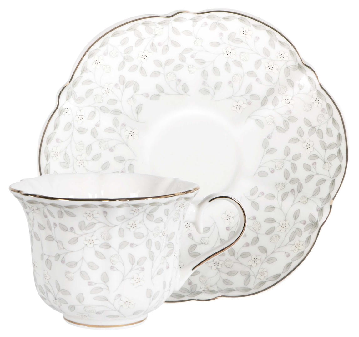 Filiżanka z finezyjnym kształtem, złotymi brzegami oraz delikatnymi zdobieniami listków. Wykonane z najwyższej jakości porcelany new bone china renomowanej marki Veroni. Wszystko zapakowane w ozdobne opakowanie (może się różnić w zależności od dostawy).