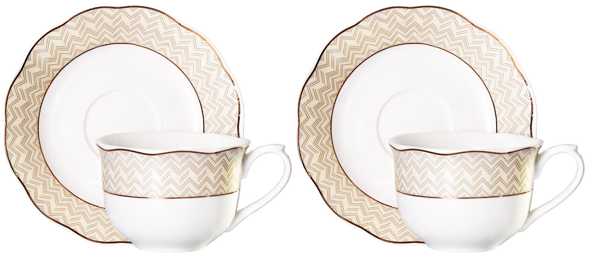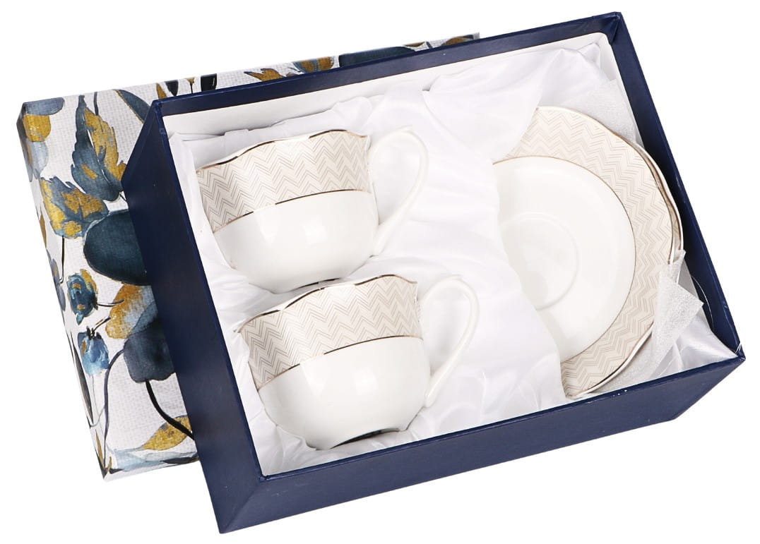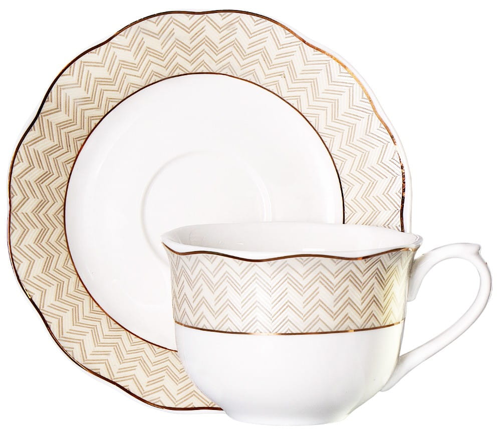 Cechą kolekcji jest ornament w jodełkę i złote zdobienia. Wykonane z najwyższej jakości porcelany new bone china renomowanej marki Veroni. Wszystko zapakowane w ozdobne opakowanie (może się różnić w zależności od dostawy).