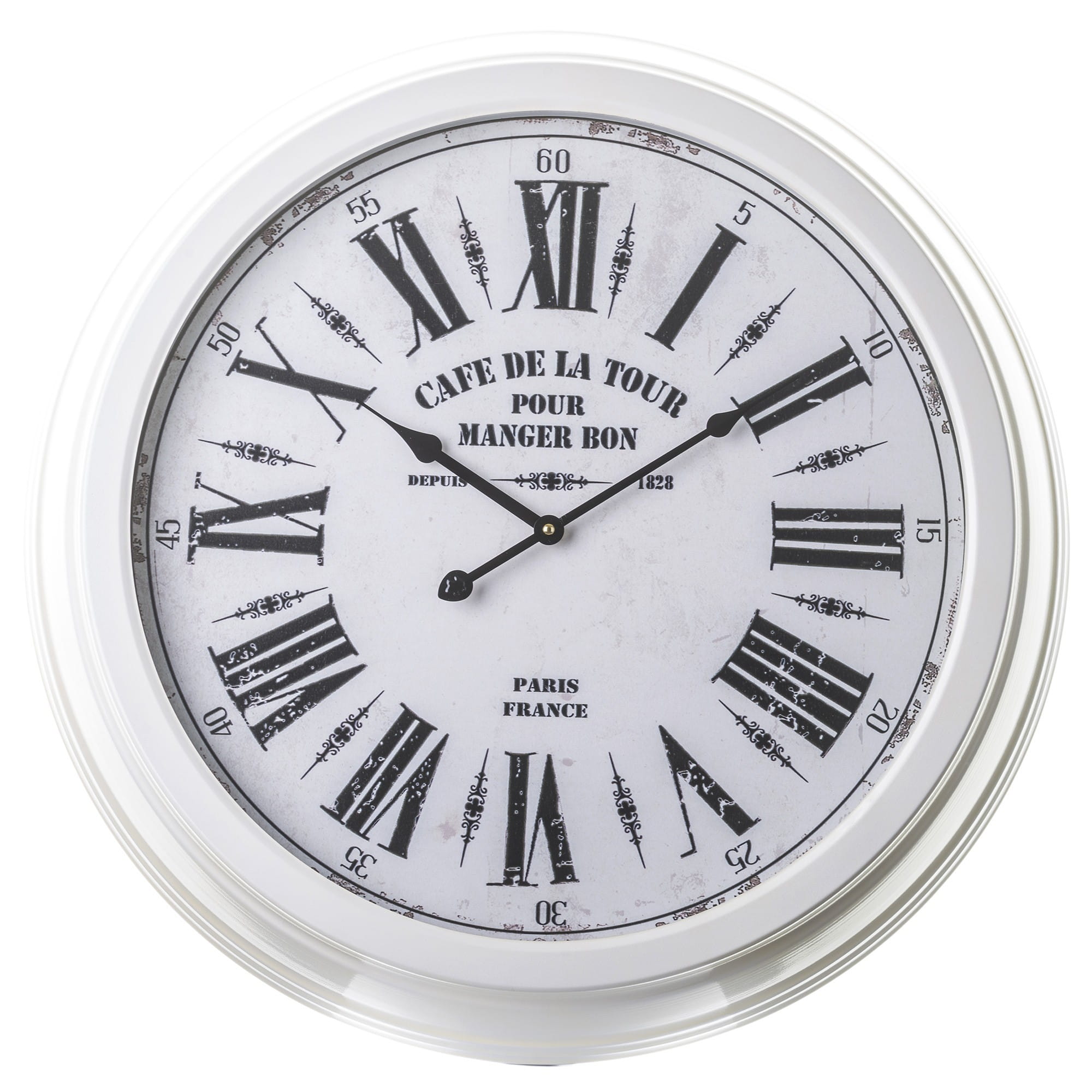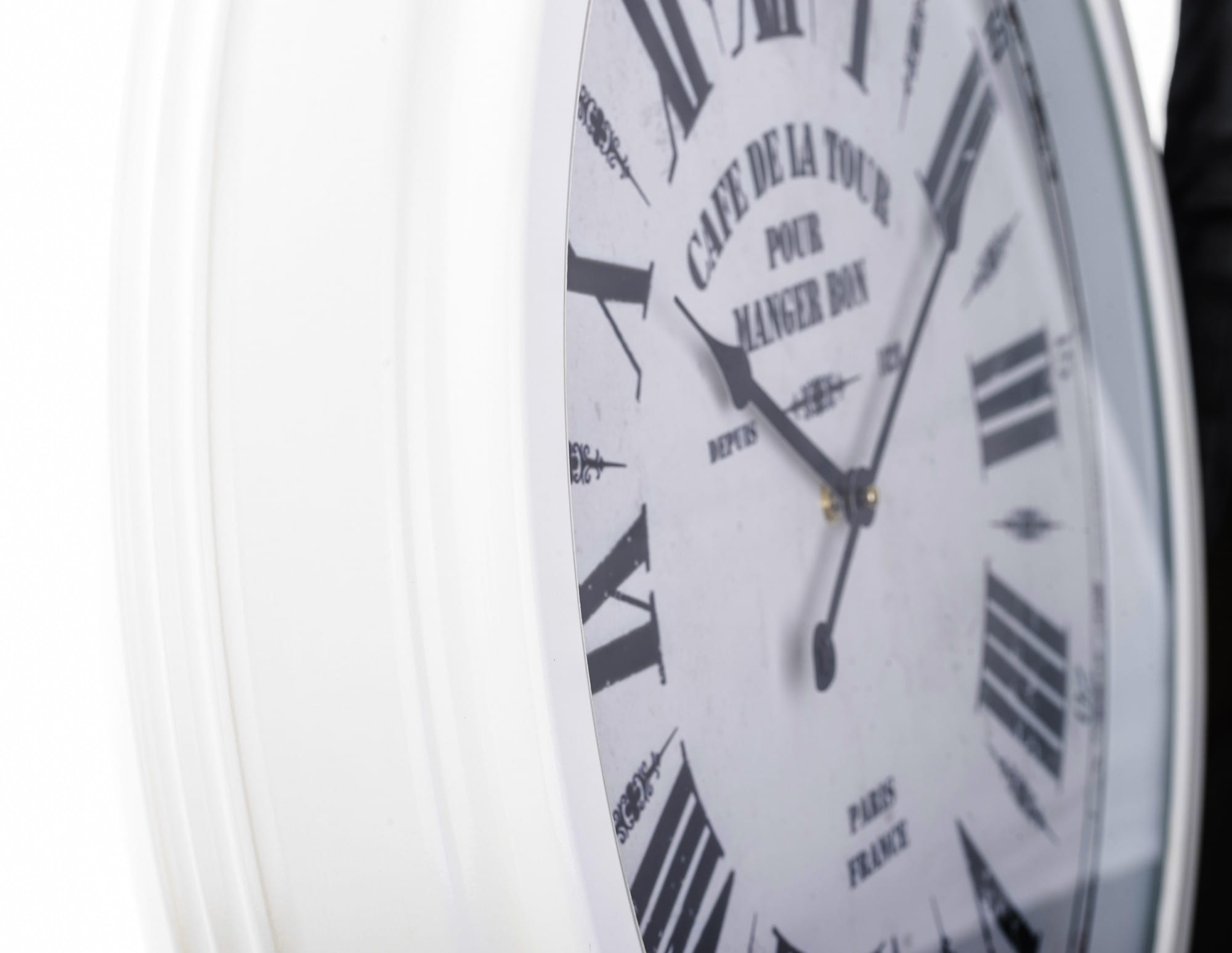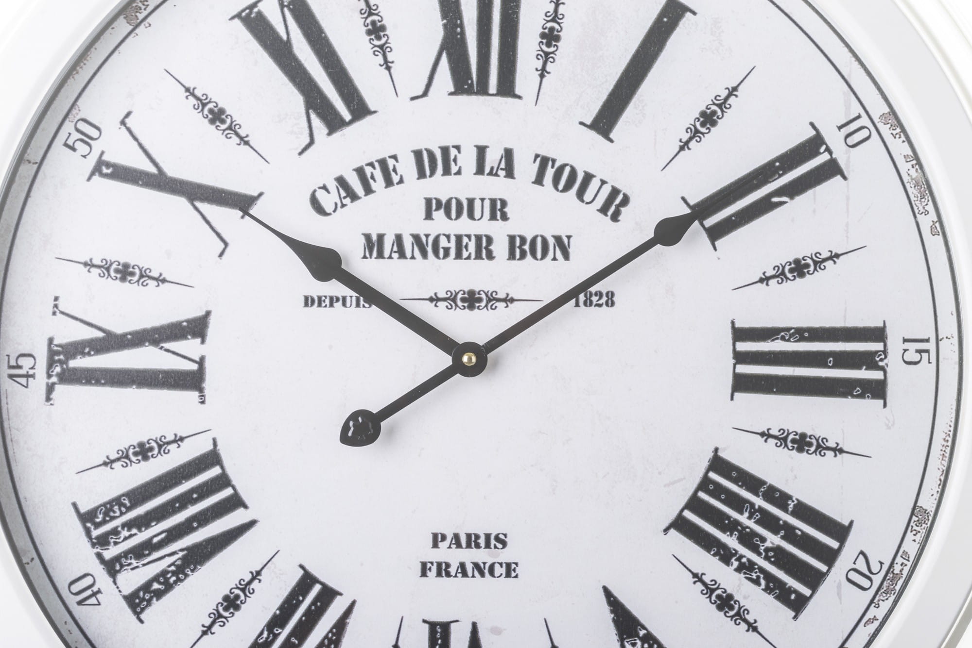 Zegar ścienny w metalowej oprawie. Solidna konstrukcja w eleganckiej kremowej barwie. Do zawieszenia w kuchni, jadalni, gabinecie, przedpokoju, gabinecie. Wnętrze zegara stanowi piękna tarcza ozdobiona francuskimi napisami, celowo postarzana jakby z innej epoki. Cyfry arabskie oznaczające godziny doskonale widoczne także z oddali. Poruszające się po tarczy zegara czarne wskazówki są również świetnie widoczne, sekundnik płynący jest cichy i subtelnie okrąża cały cyferblat. Z zamierzenia producenta, zegar ma imitować stary egzemplarz, dlatego w oprawie czy cyferblacie liczne nawiązania i elementy postarzające. Mechanizm kwarcowy pracuje na baterii typu AA (popularny paluszek). Z tyłu uchwyt do zamocowania zegara na ścianie.