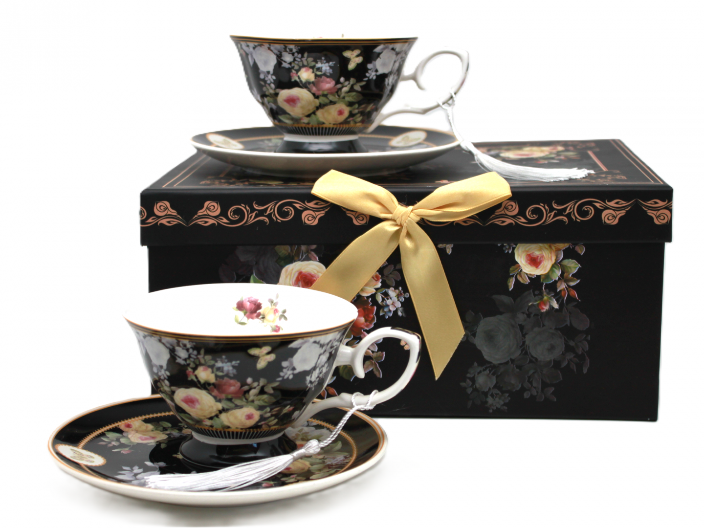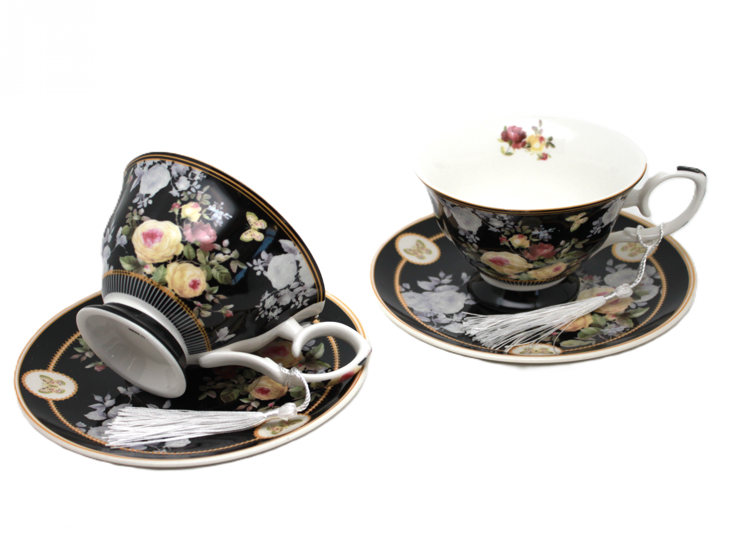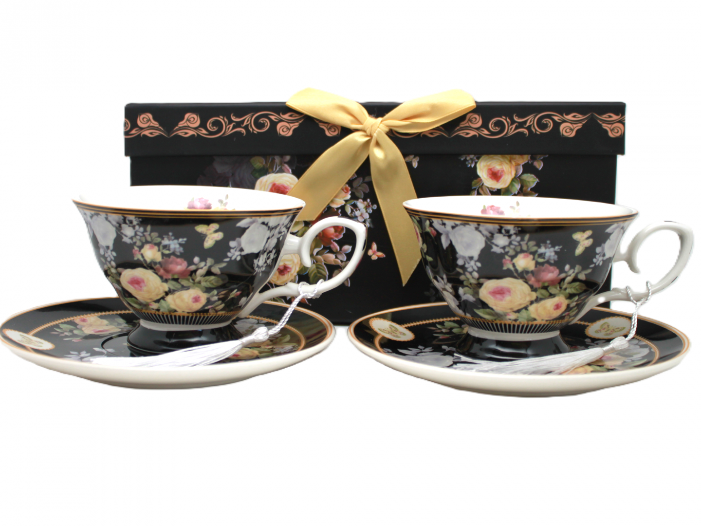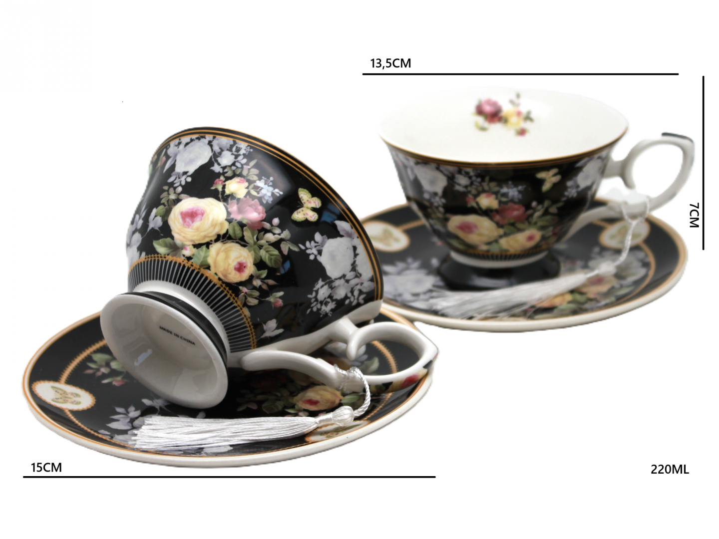 Zachwyć się połączeniem klasyki i nowoczesności z wyjątkowym kompletem filiżanek porcelanowych o pojemności 220 ml, które urzekają głęboką czernią i luksusowym, kwiatowym wzorem. Ten ekskluzywny zestaw zawiera dwie filiżanki ze spodkami, zdobione pastelowymi różami, motylami i subtelnym złoceniem.