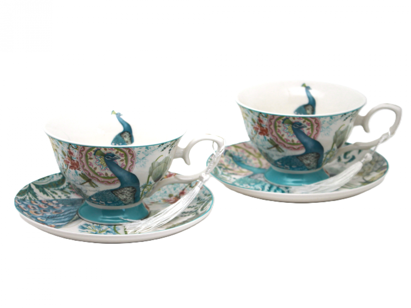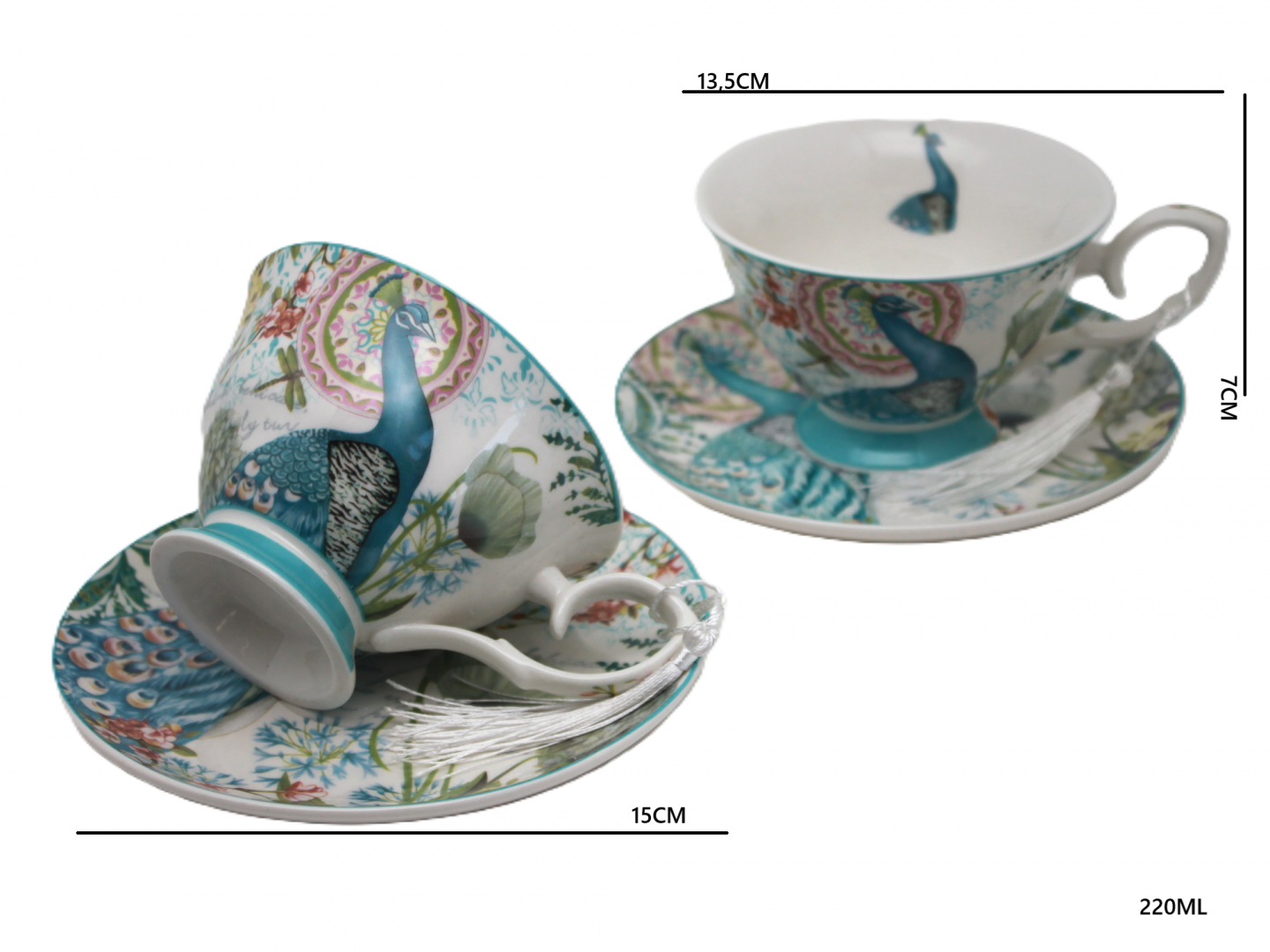 Dodaj odrobiny luksusu do codziennych rytuałów picia herbaty lub kawy dzięki wyjątkowemu kompletowi filiżanek porcelanowych 220 ml z motywem pawia. Ten elegancki zestaw zawiera dwie filiżanki z dopasowanymi spodkami, ozdobione przepięknym, wielobarwnym wzorem pawia w otoczeniu kwiatów i roślin, który przyciąga wzrok i dodaje klasy każdemu wnętrzu.