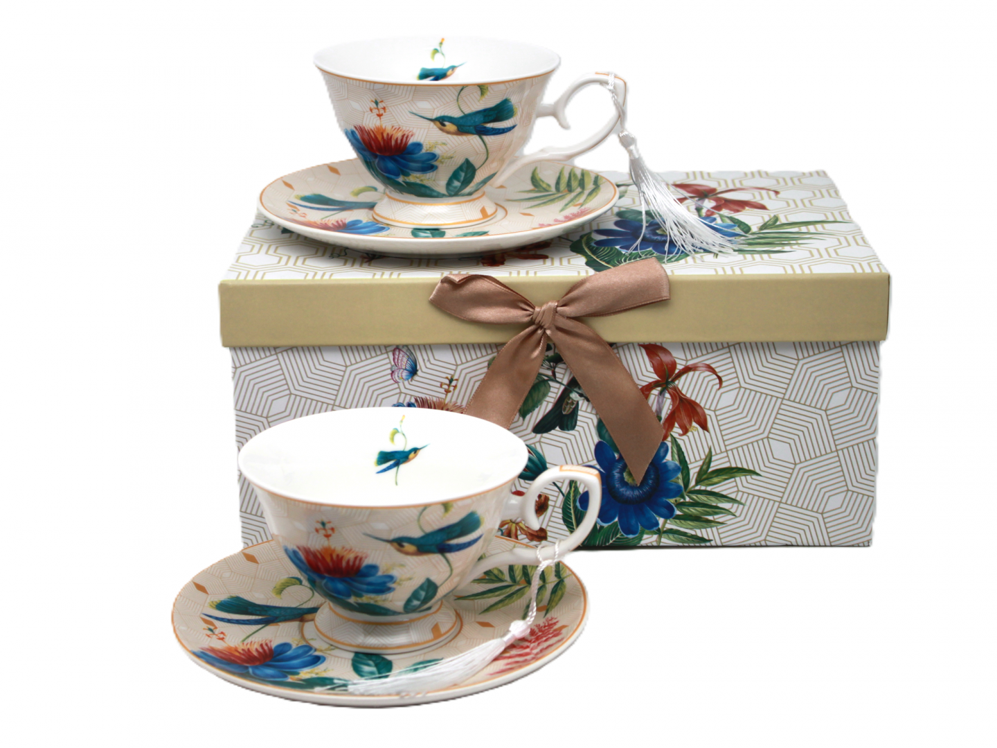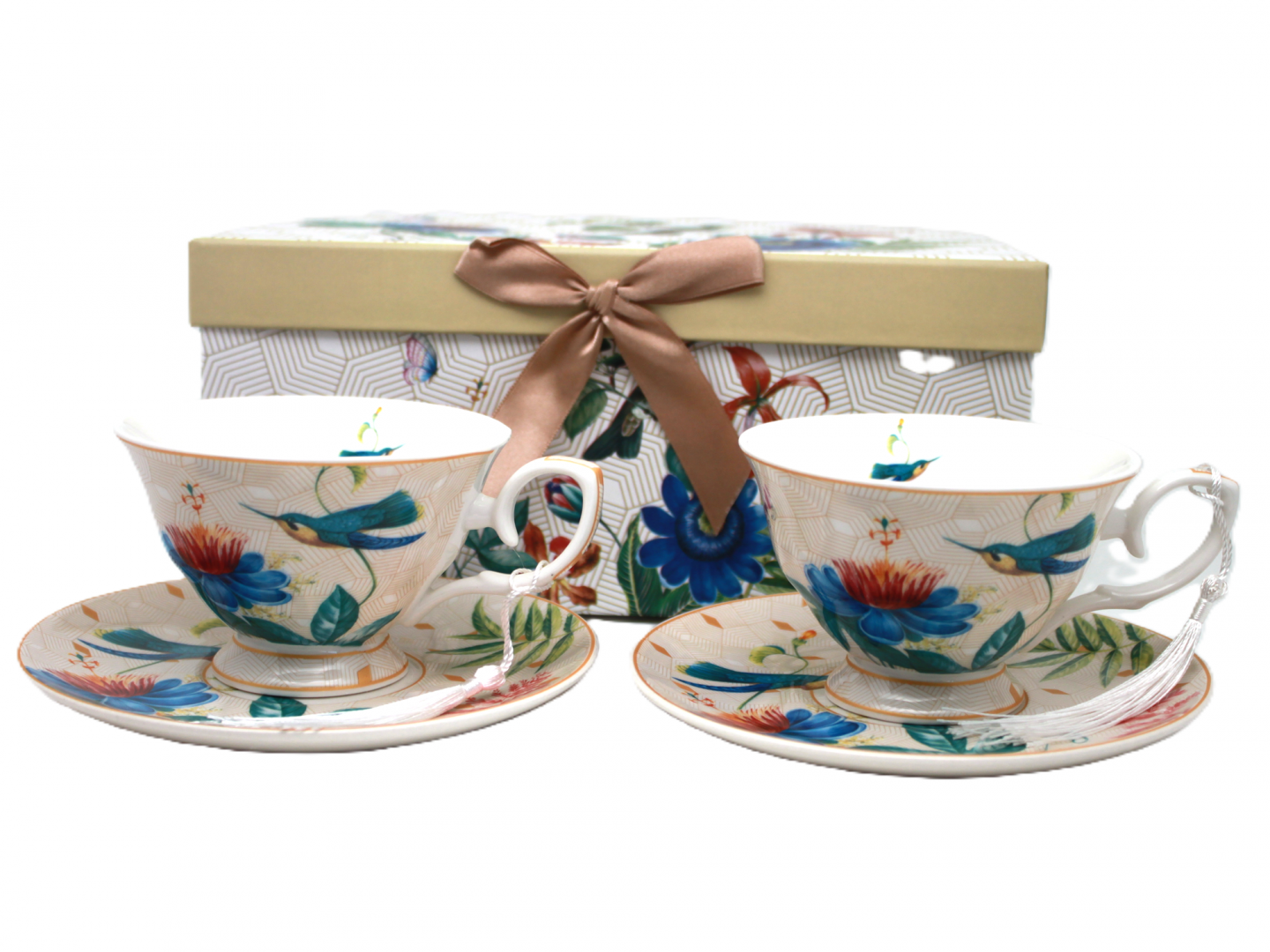 Bogato zdobione wzory z kolibrem, intensywnie niebieskimi i czerwonymi kwiatami oraz zielonymi liśćmi nadają zestawowi unikalnego charakteru. Stylowe pudełko prezentowe z satynową kokardą w odcieniu złamanej miedzi czyni z tego zestawu gotowy pomysł na luksusowy prezent.