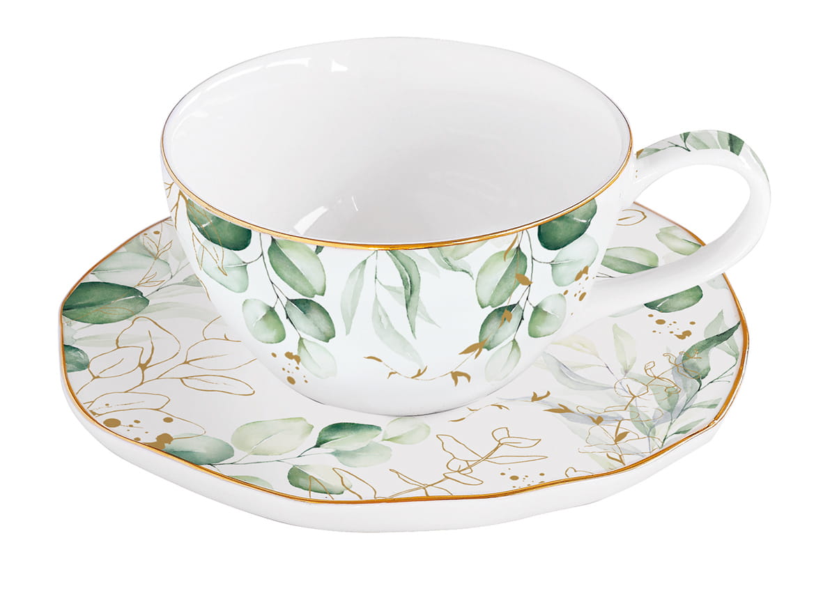 Duża, pojemna filiżanka ze spodkiem. Wykonana z porcelany zachwyca modnym motywem pięknych zielonych liści z złotymi dodatkami. Filiżanka umieszczona jest w eleganckim pudełku. Świetnie sprawdzi się jako prezent na wiele okazji.