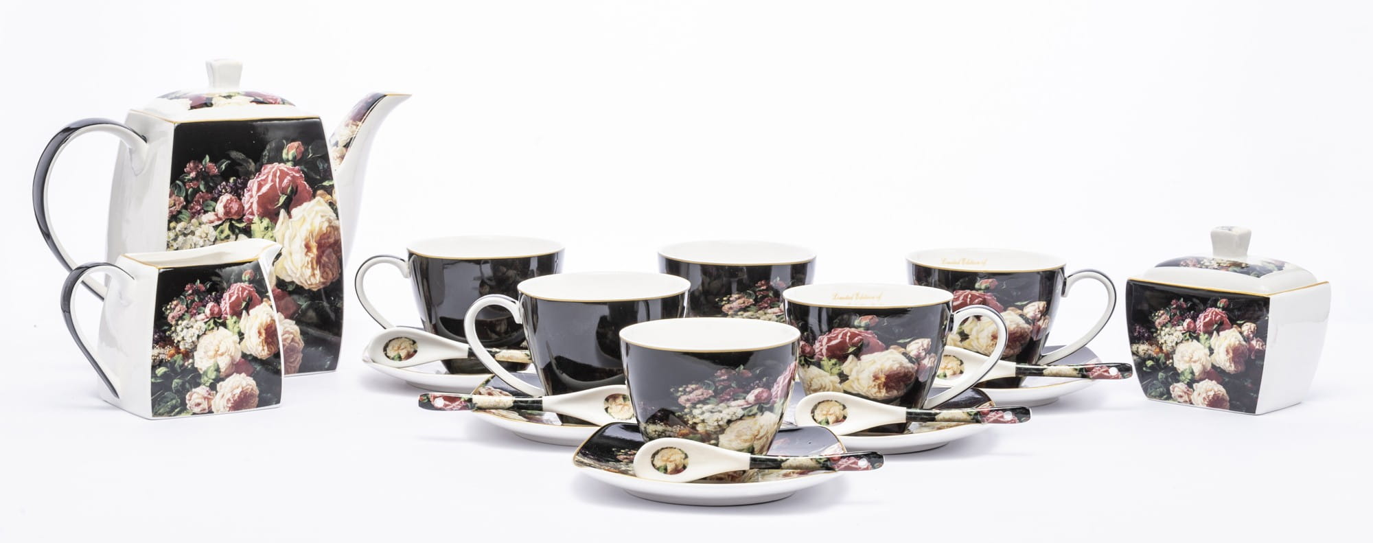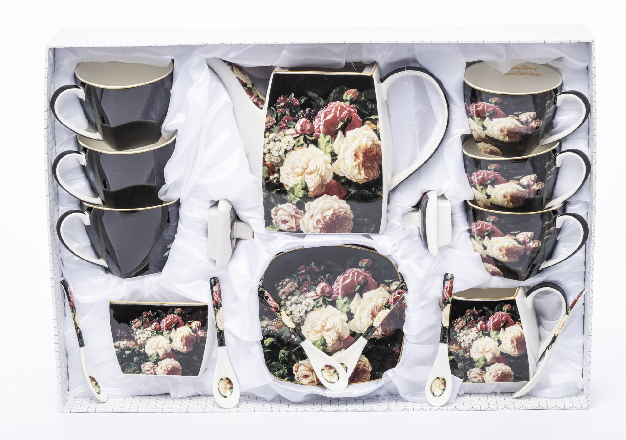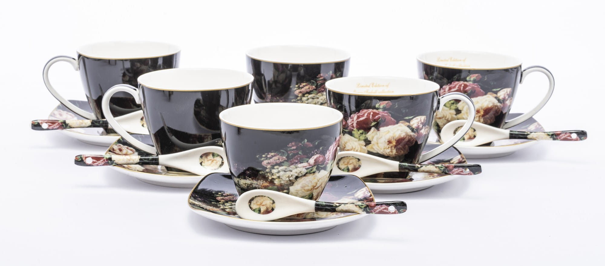 Komplet filiżanek porcelanowych w kolorze czarnym, przyciągają uwagę przepięknym motywem kwiatów. Filiżanki nadają się do serwowania zarówno kawy jak i herbaty. Komplet jest bardzo elegancki i z pewnością uprzyjemni delektowanie się pysznymi napojami.Wszystko zapakowane w ozdobne opakowanie (może się różnić w zależności od dostawy).