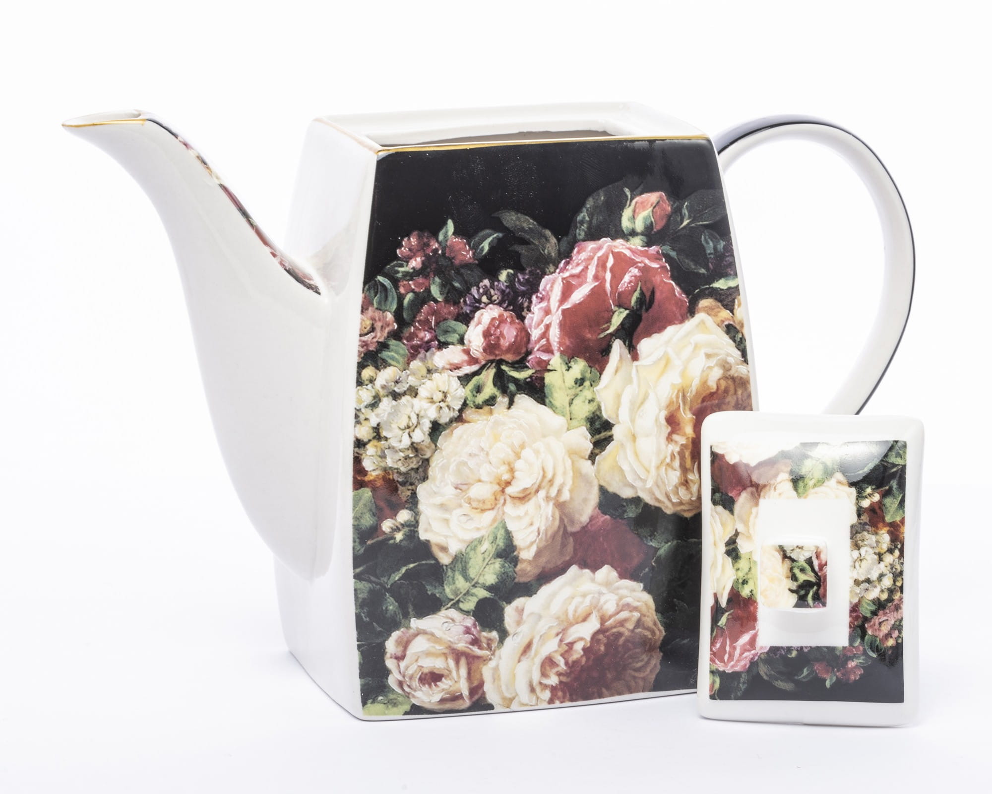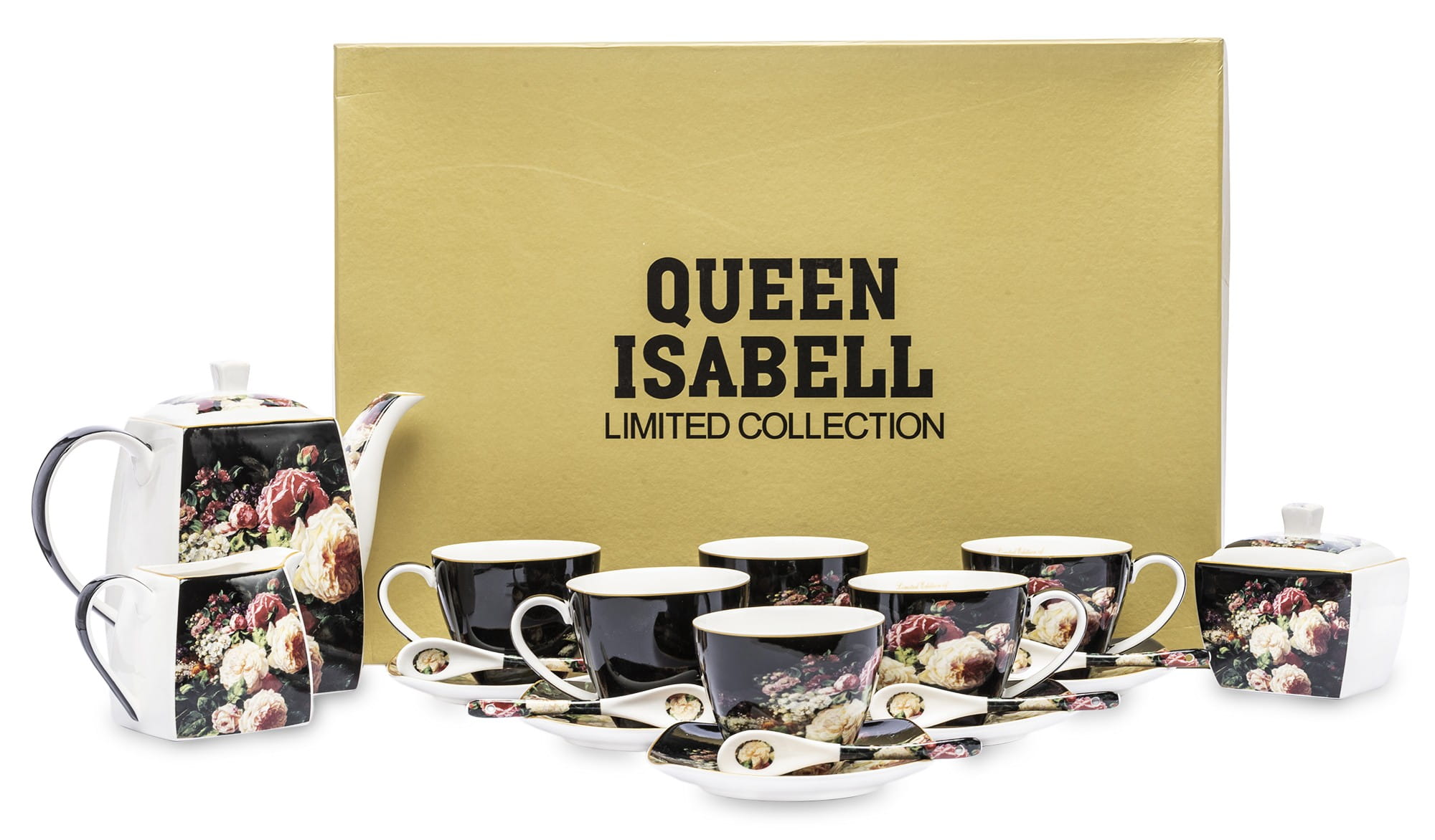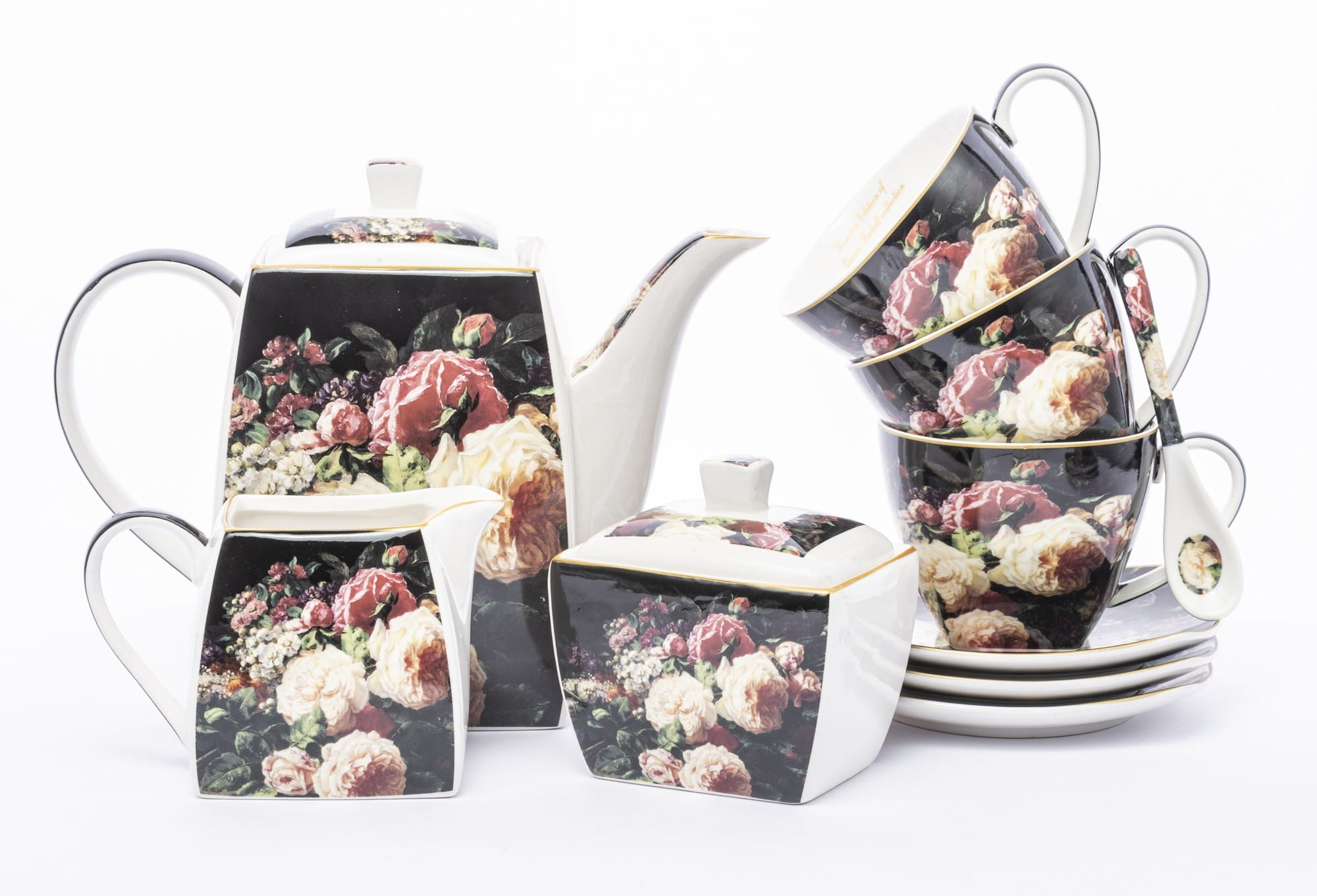 Komplet filiżanek porcelanowych w kolorze czarnym, przyciągają uwagę przepięknym motywem kwiatów. Filiżanki nadają się do serwowania zarówno kawy jak i herbaty. Komplet jest bardzo elegancki i z pewnością uprzyjemni delektowanie się pysznymi napojami.Wszystko zapakowane w ozdobne opakowanie (może się różnić w zależności od dostawy).