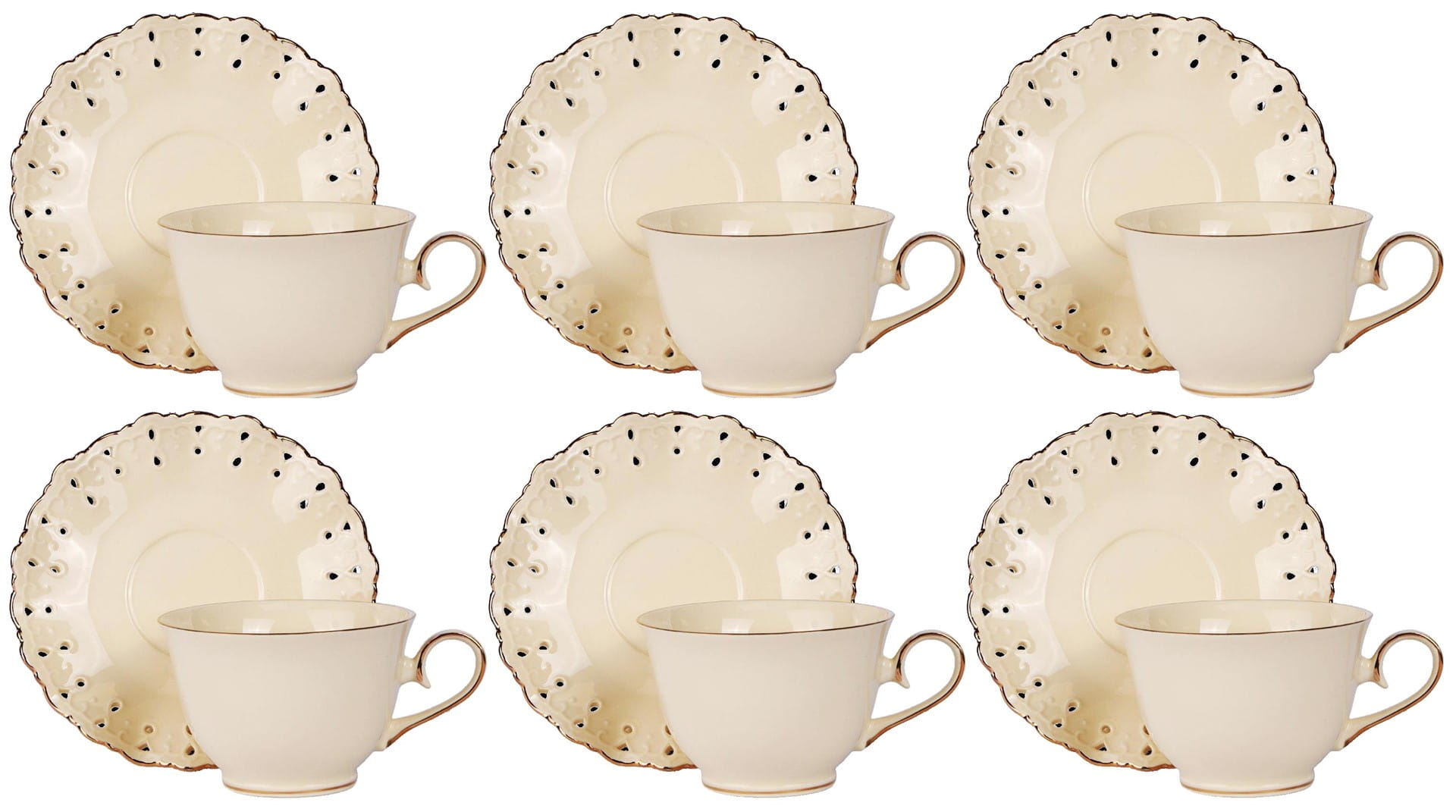 Filiżanki porcelanowe ze złotymi zdobieniami i fantazyjnym, ażurowym spodkiem. Wykonane z najwyższej jakości porcelany new bone china renomowanej marki Veroni. Wszystko zapakowane w ozdobne opakowanie (może się różnić w zależności od dostawy).