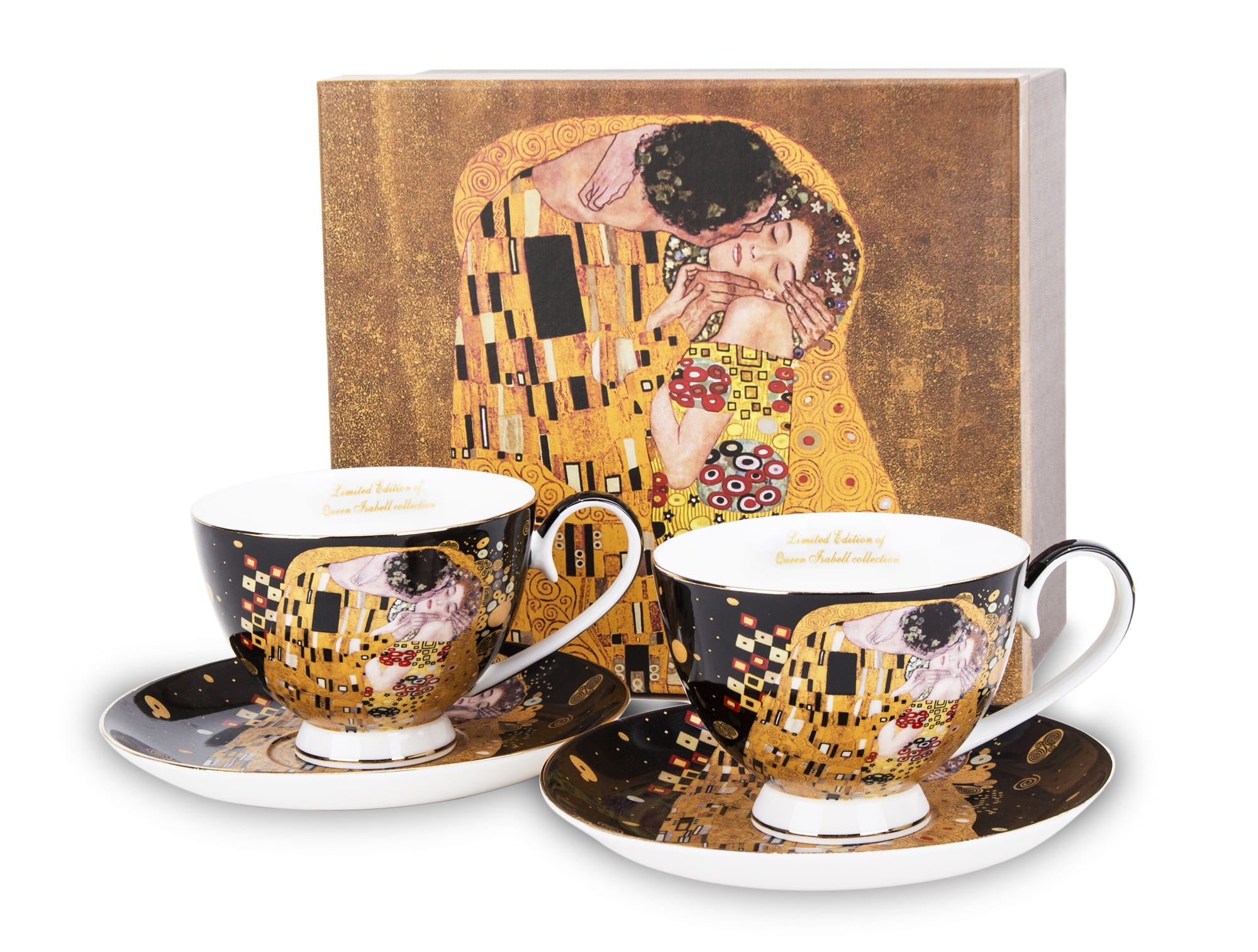 Komplet dwóch filiżanek, wykonany z wysokiej jakości porcelany. Zewnętrzną część filiżanek oraz spodków ozdobiono nadrukiem, motywem ze słynnego obrazu Pocałunek, mistrza pędzla Gustava Klimta. Każdy element zestawu wykonano z największą starannością. Prezentowany komplet zapakowany jest w opakowanie z identycznym motywem na wieczku.
