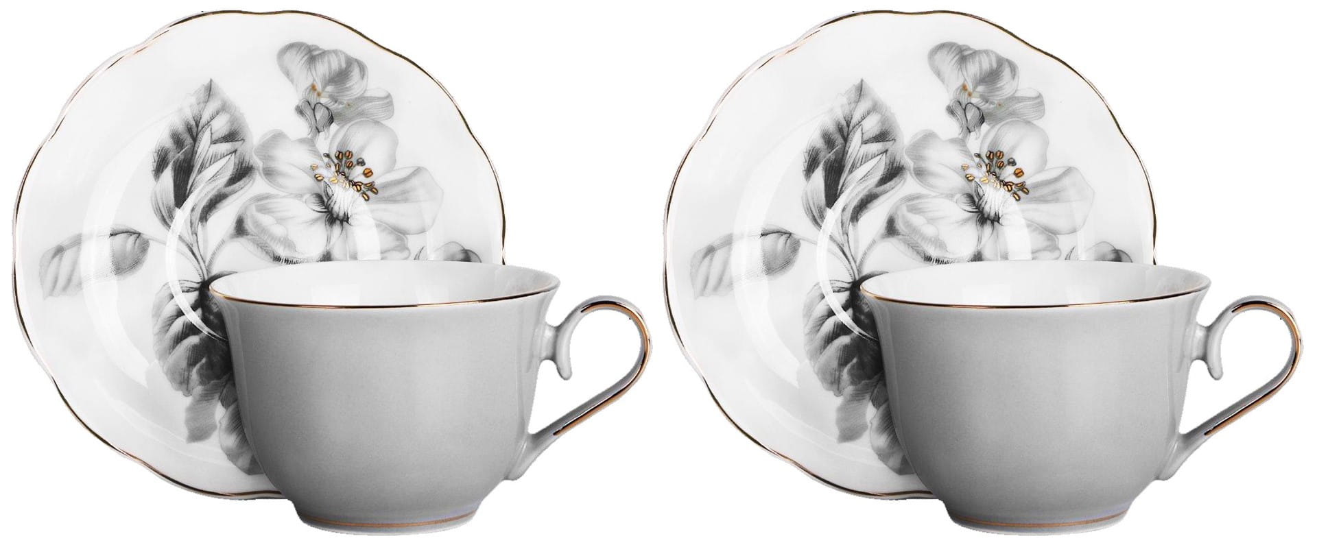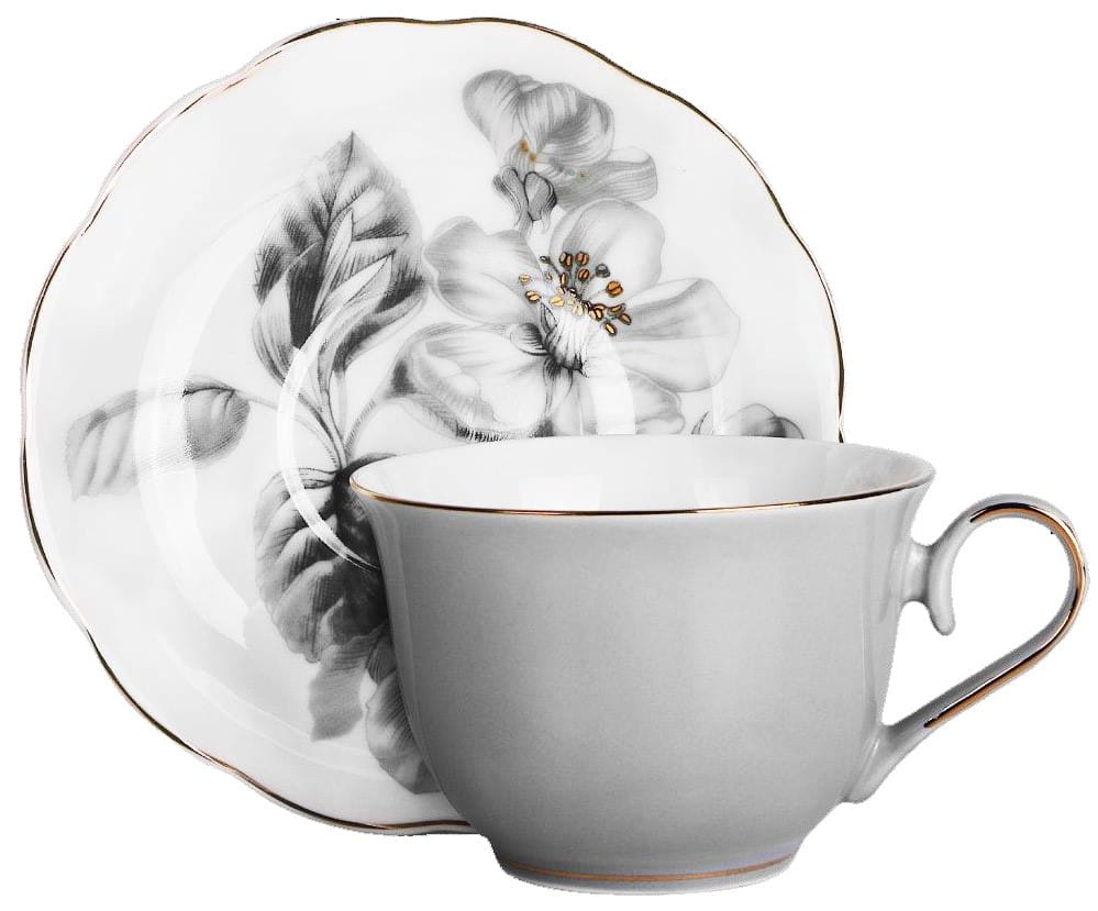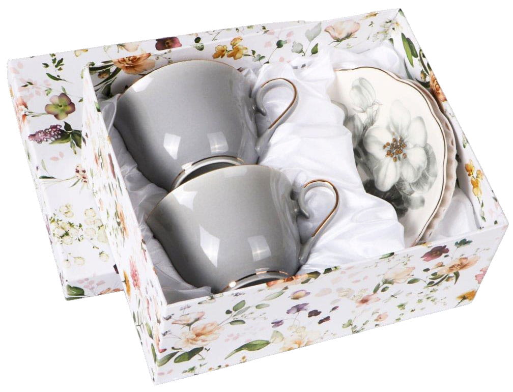 Filiżanki porcelanowe ze złotymi zdobieniami i kwiatowym spodkiem. Wykonane z najwyższej jakości porcelany new bone china renomowanej marki Veroni. Wszystko zapakowane w ozdobne opakowanie (może się różnić w zależności od dostawy).