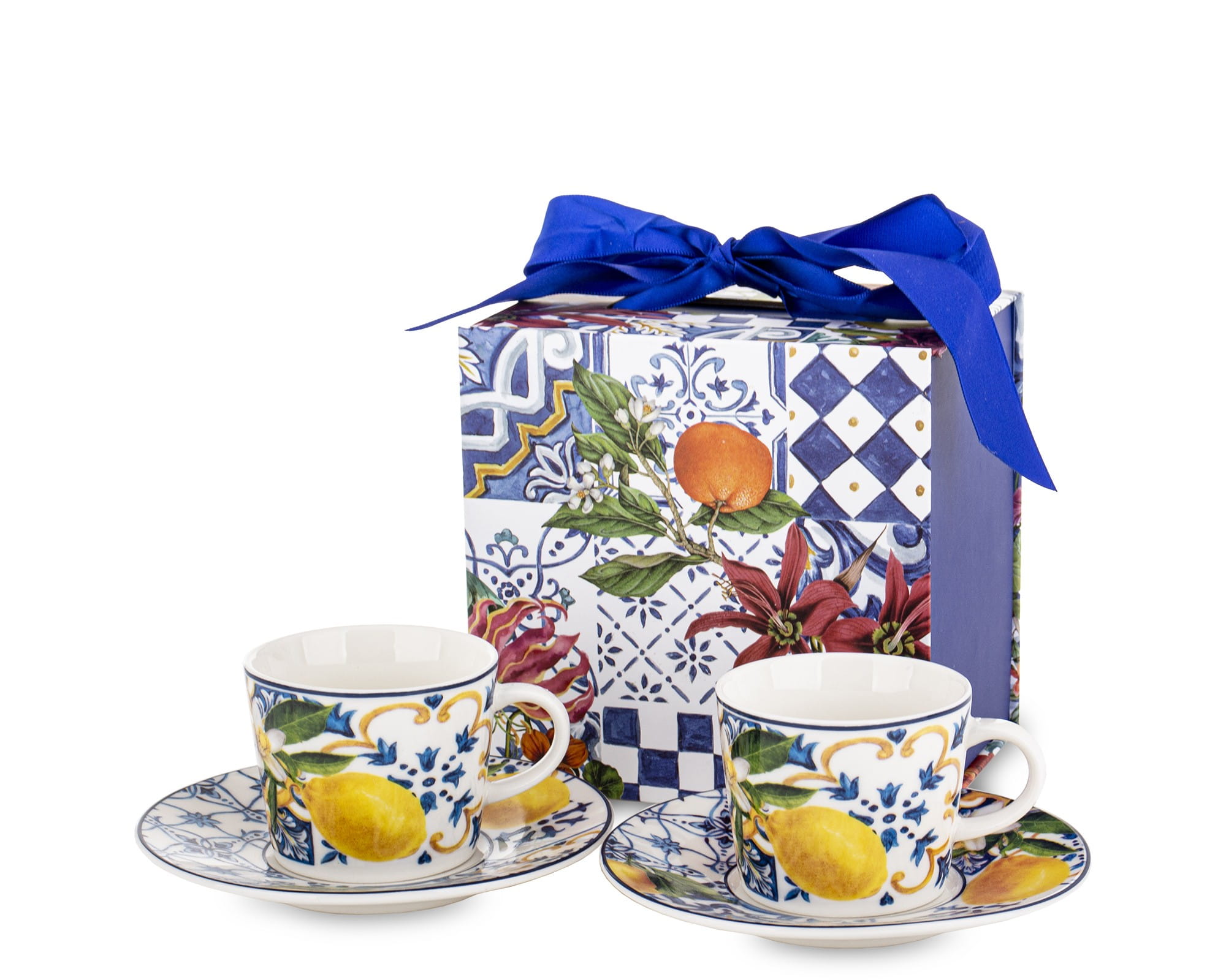 Zestaw filiżanek espresso dla dwojga to elegancka propozycja dla miłośników wyjątkowej porcelany i intensywnych smaków. Każda filiżanka o pojemności 90 ml zachwyca subtelnym, kolorowym wzorem inspirowanym śródziemnomorską estetyką. Połączenie klasycznej biało-niebieskiej kratki z delikatnymi roślinnymi akcentami, kwiatami oraz soczystymi cytrynami tworzy niezwykle stylowy i artystyczny efekt.