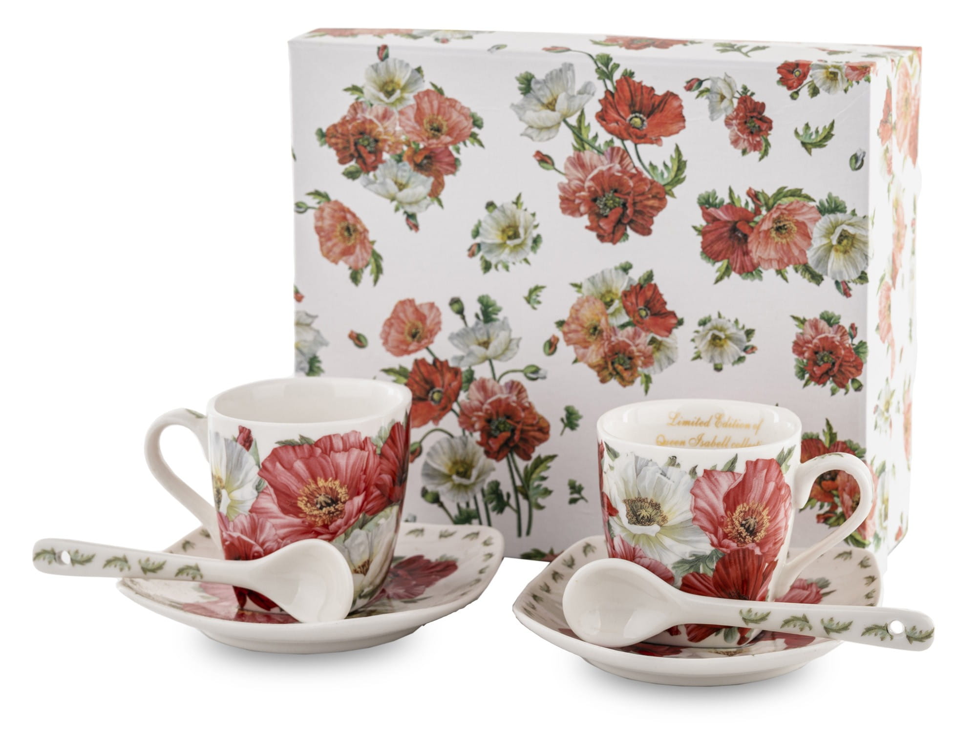 Niezwykle kobiecy komplet: filiżanki do espresso. Wykonane z ceramiki porcelanowej zachwycają umieszczonym wzorem kwiatów. Cały zestaw umieszczony jest w opakowaniu, które posiada identyczny wzór jak filiżanki. Prezentowany komplet świetnie sprawdzi się jako prezent na wiele okazji.