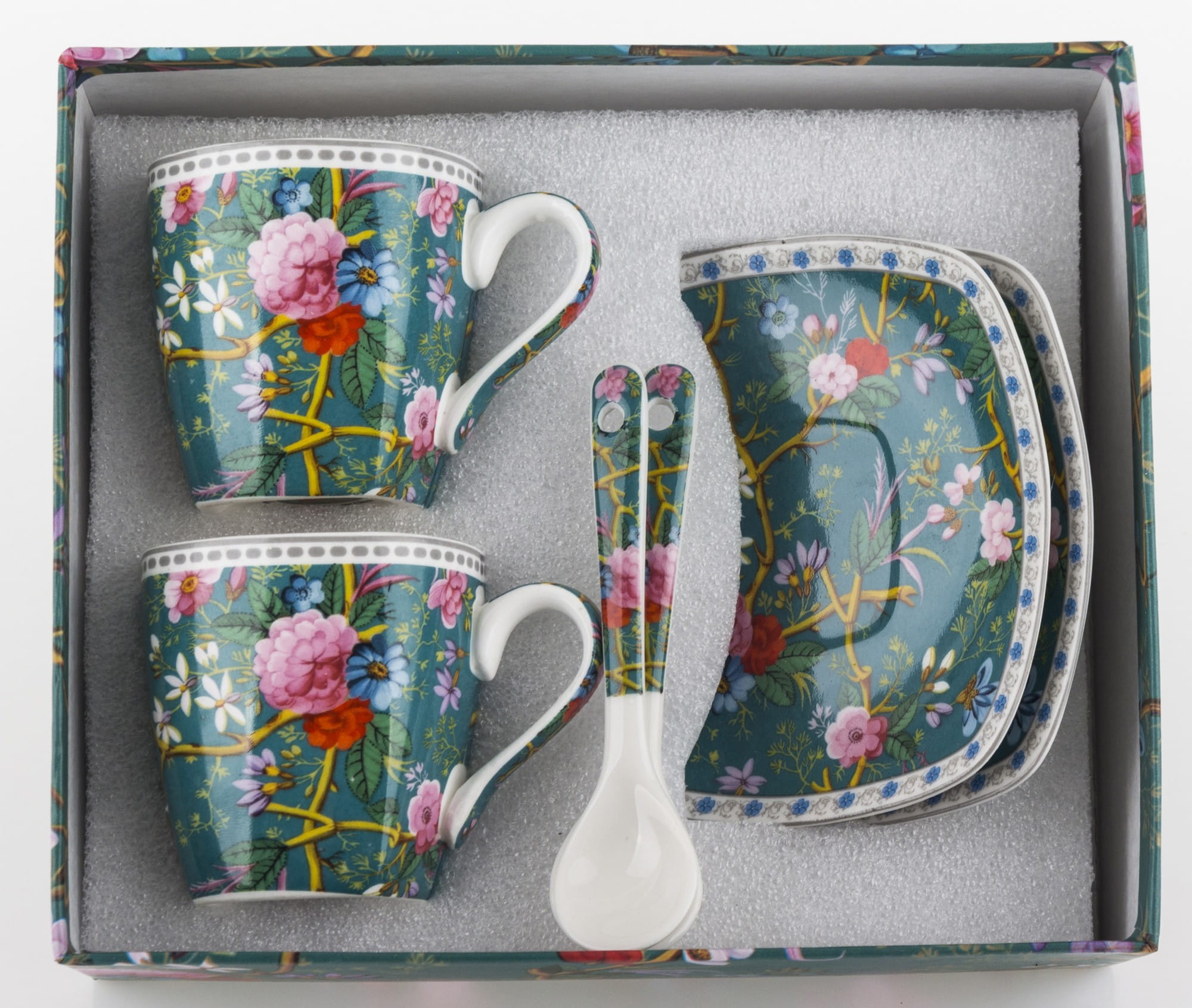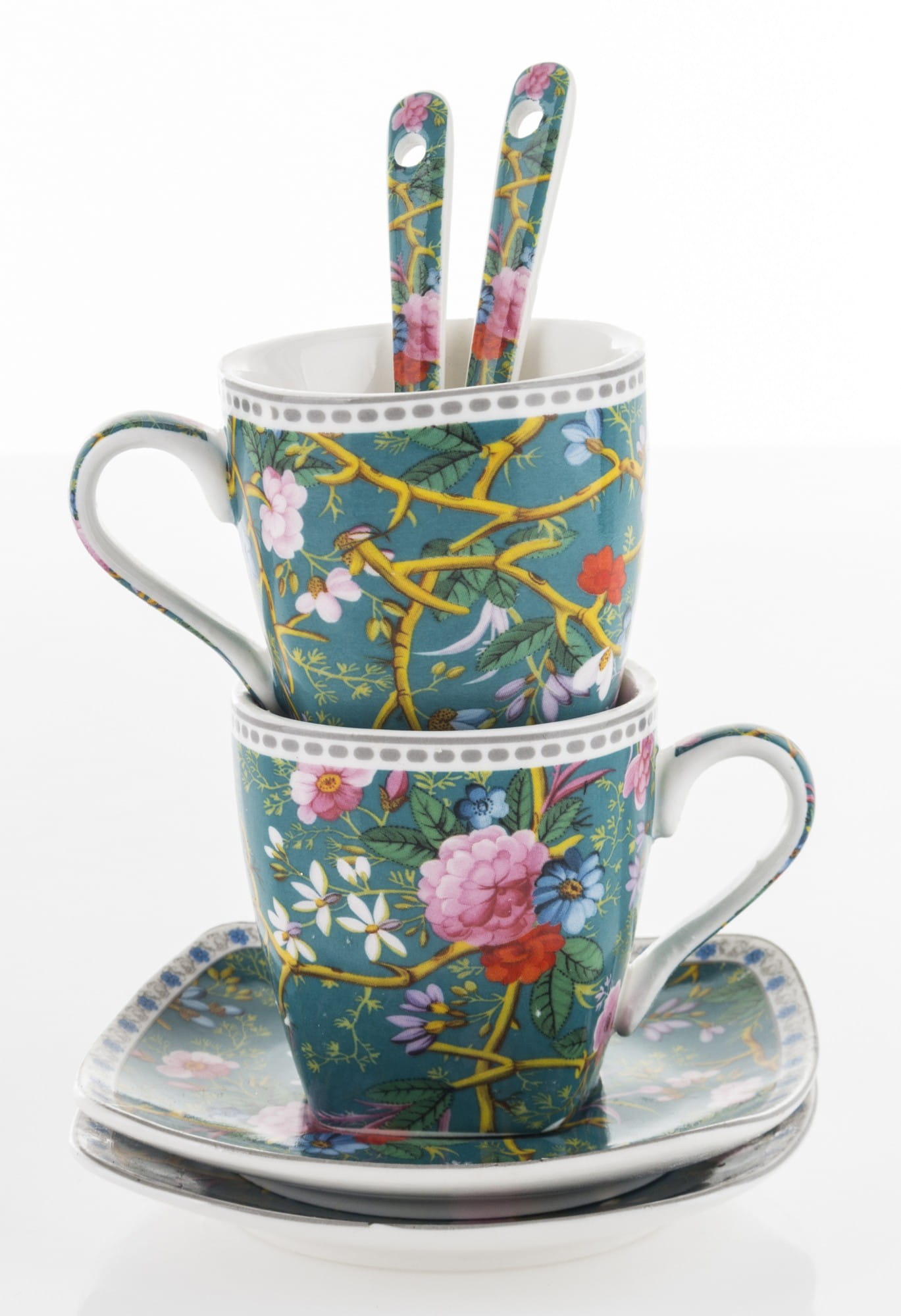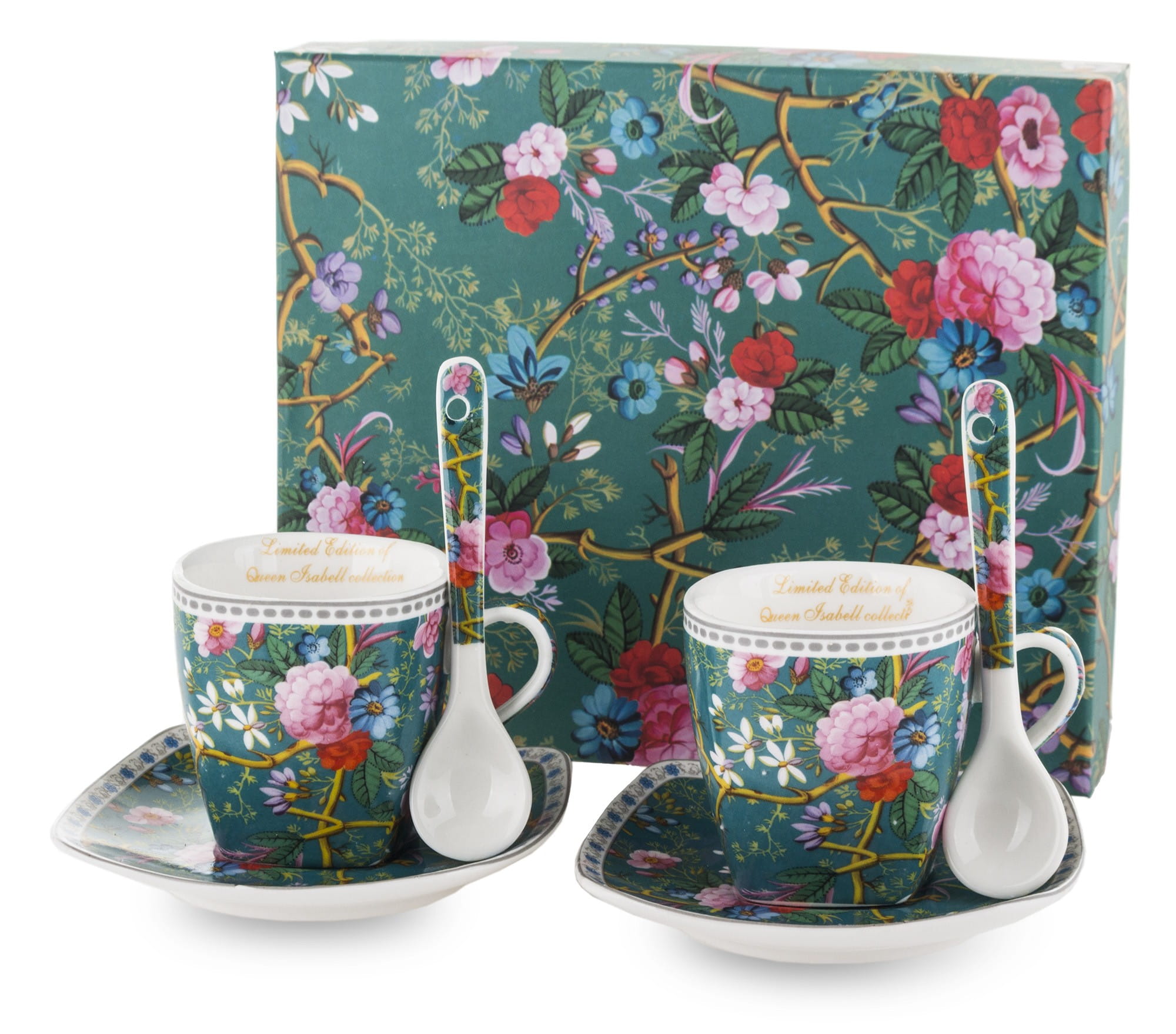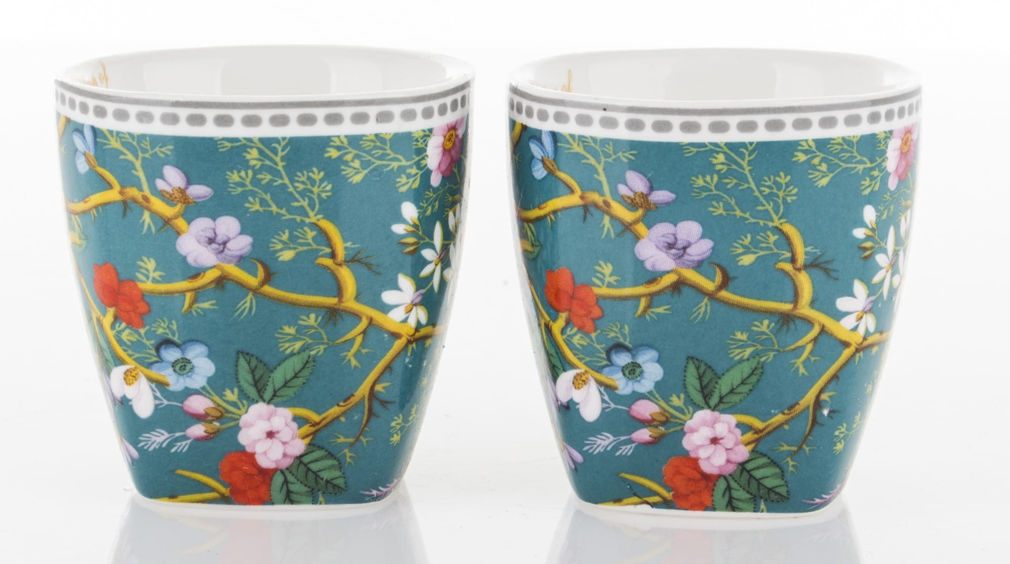 Niezwykle kobiecy komplet: filiżanki do espresso. Wykonane z ceramiki porcelanowej zachwycają żywym, intensywnym motywem kwiatowym umieszczonym na filiżankach, spodkach i łyżeczkach. Ranty filiżanek i spodków wieńczą paski. Cały zestaw umieszczony jest w opakowaniu, które posiada identyczny wzór jak filiżanki. Prezentowany komplet świetnie sprawdzi się jako prezent na wiele okazji.