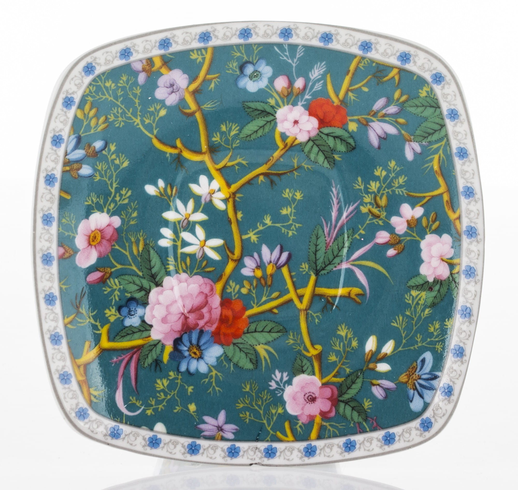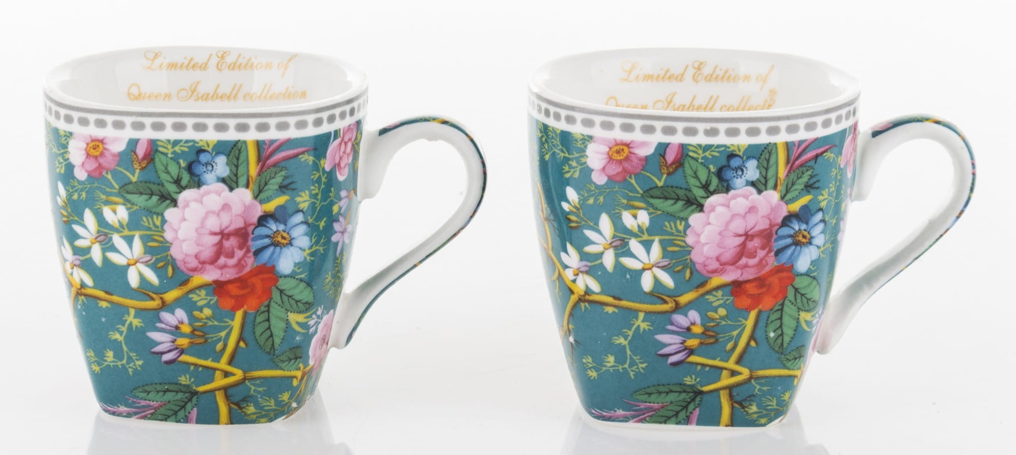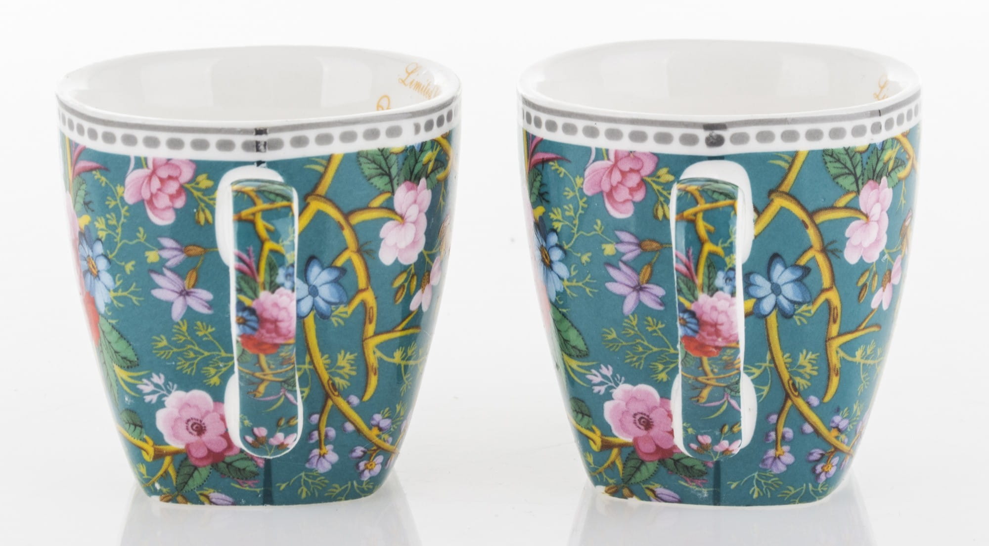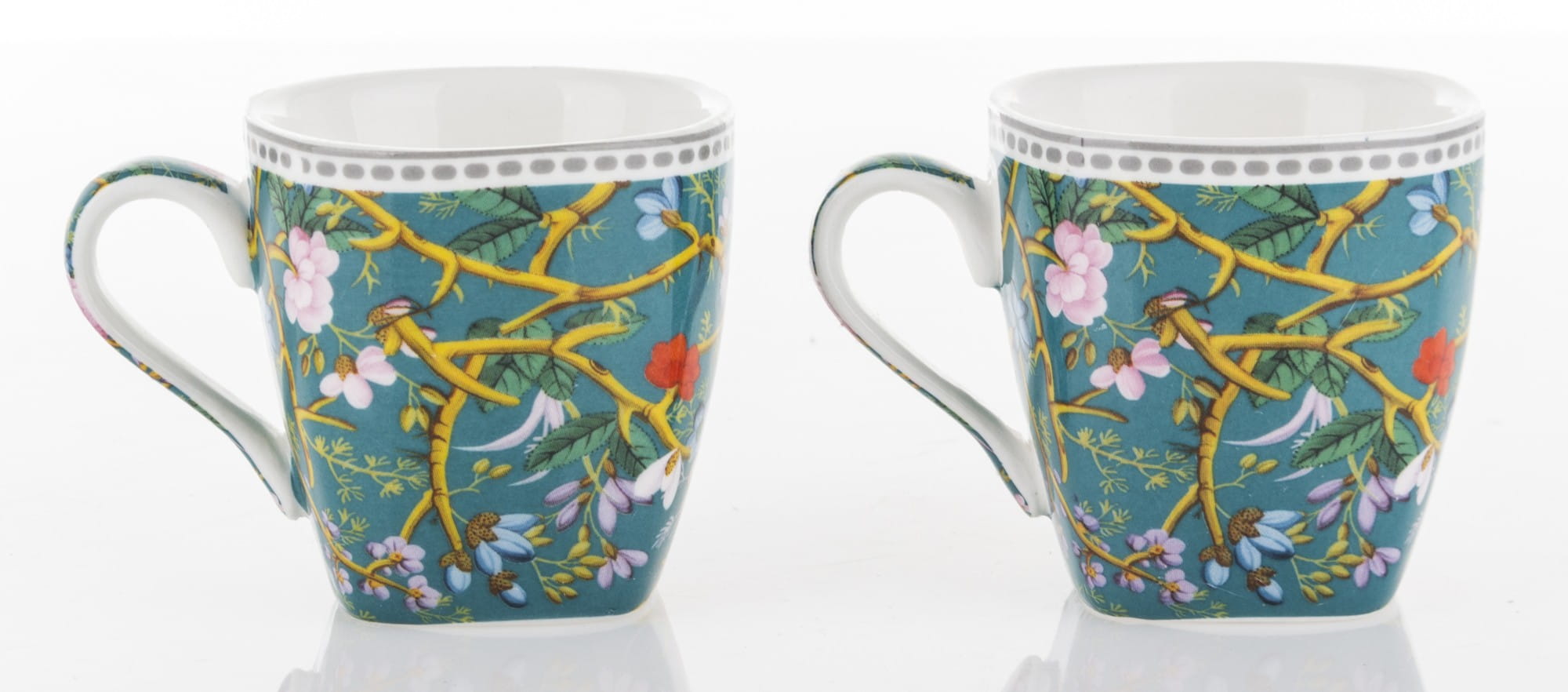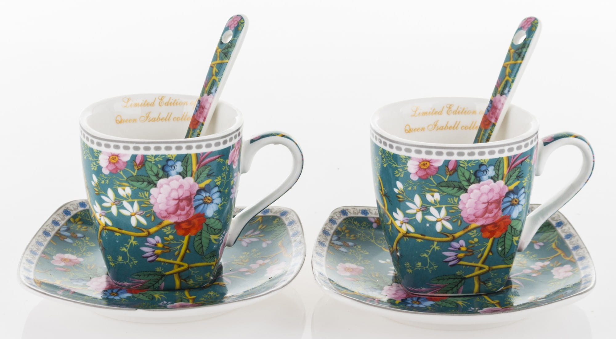 Niezwykle kobiecy komplet: filiżanki do espresso. Wykonane z ceramiki porcelanowej zachwycają żywym, intensywnym motywem kwiatowym umieszczonym na filiżankach, spodkach i łyżeczkach. Ranty filiżanek i spodków wieńczą paski. Cały zestaw umieszczony jest w opakowaniu, które posiada identyczny wzór jak filiżanki. Prezentowany komplet świetnie sprawdzi się jako prezent na wiele okazji.