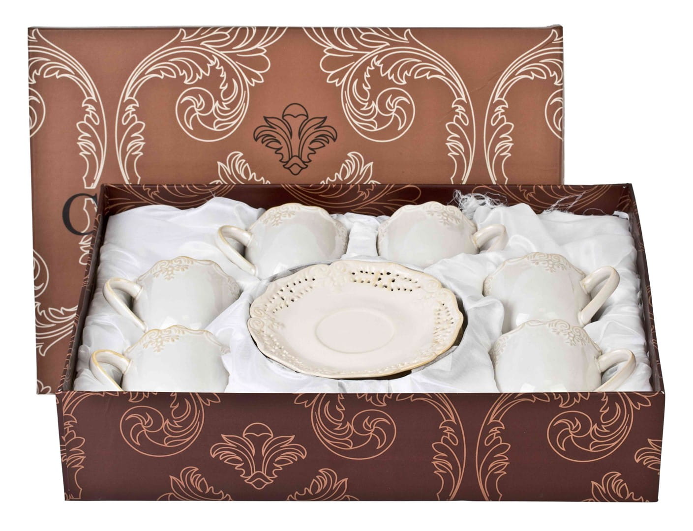 Ceramiczne filiżanki ecru ze zdobieniami ażurowymi z ponadczasowej kolekcji Amelia. Wykonane z najwyższej jakości ceramiki ażurowej renomowanej marki Veroni. Wszystko zapakowane w ozdobne opakowanie (może się różnić w zależności od dostawy).