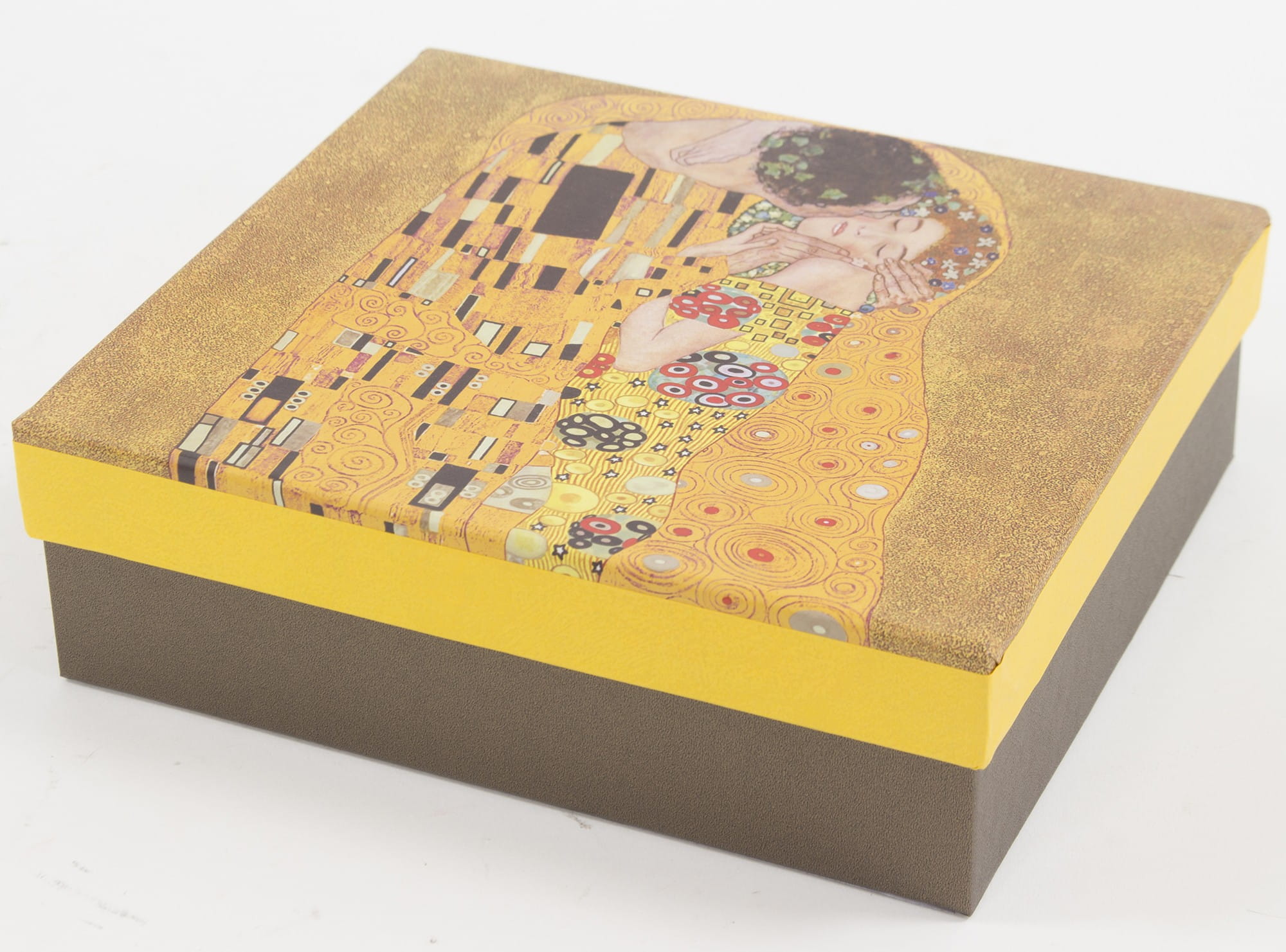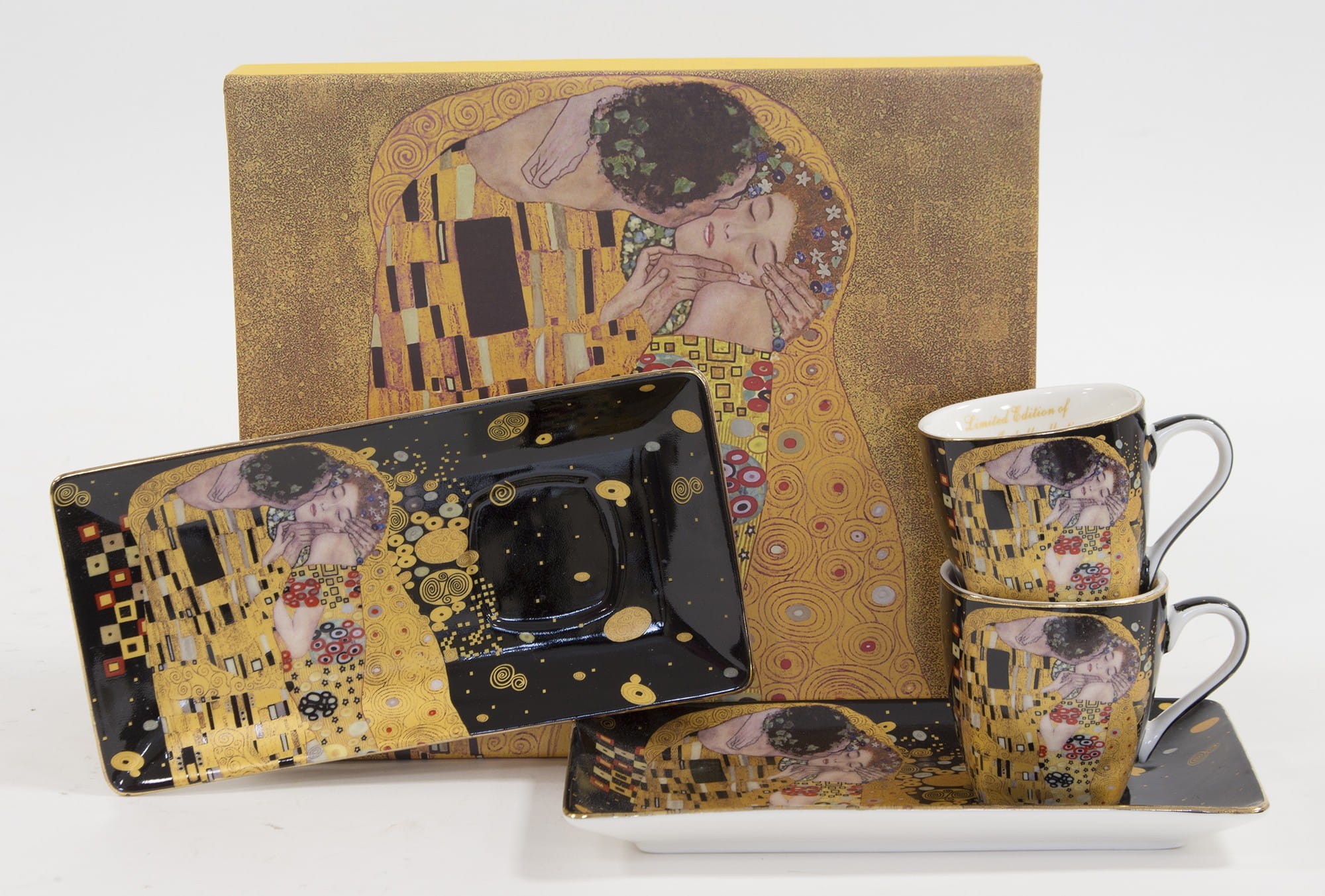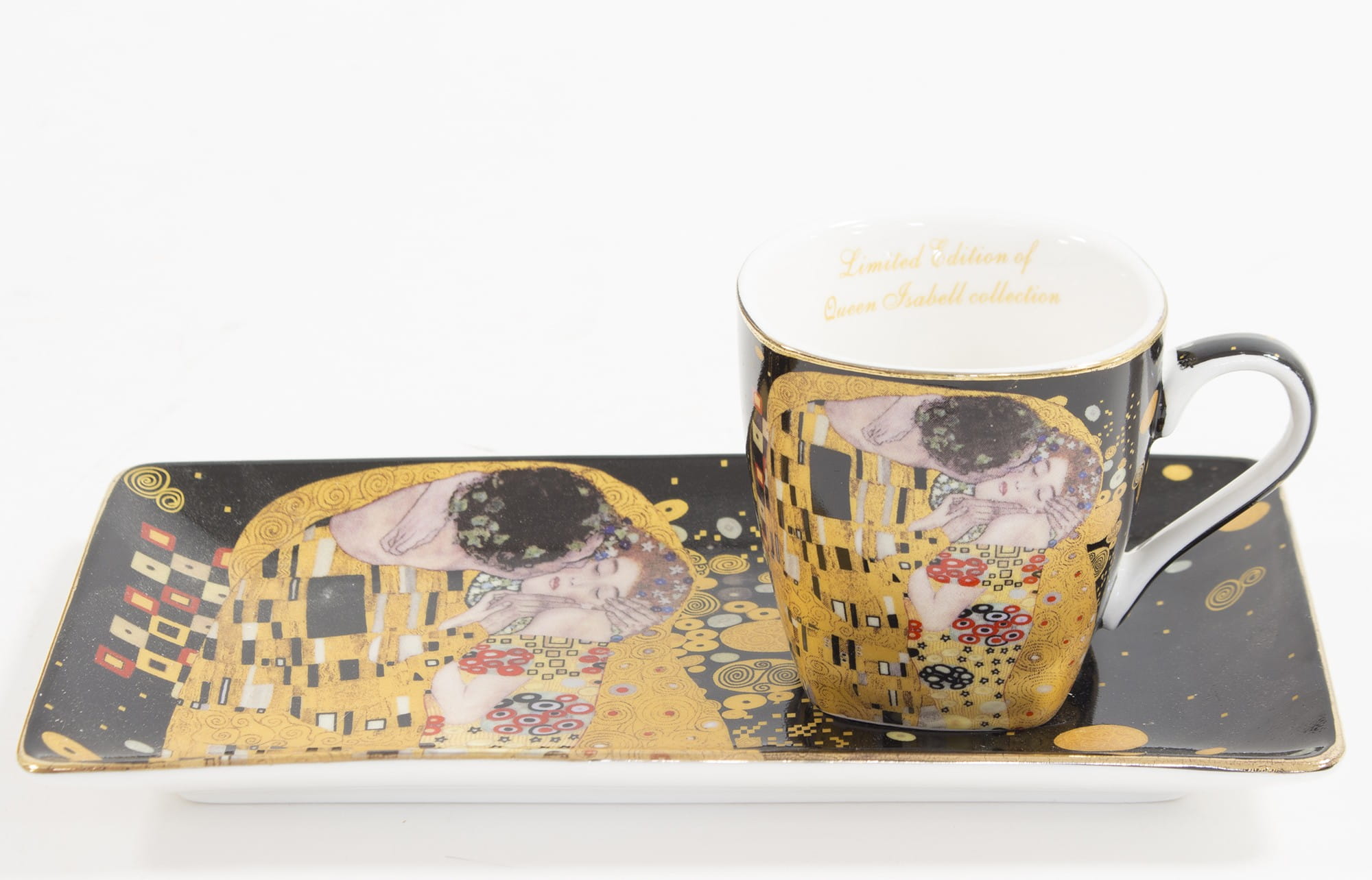 Zestaw dla dwóch osób: malutkie filiżanki dla smakoszy kawy espresso. Prezentowany zestaw wykonany jest z ceramiki porcelanowej. Posiada kolorowy nadruk z motywem obrazu „Pocałunek” Gustava Klimta. Zestaw stworzony z myślą o kolekcjonerach porcelany z motywem Klimta, czy po prostu sympatyka sztuki. Do każdej filiżanki dołączony jest podłużny talerzyk. Na talerzyku, oprócz filiżanki kawy, znajduje się miejsce na poczęstunek. Filiżanki zapakowane są w oryginalne opakowanie z motywem Klimta na wieczku.