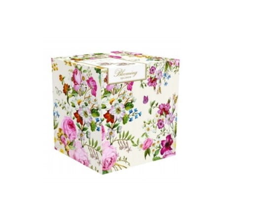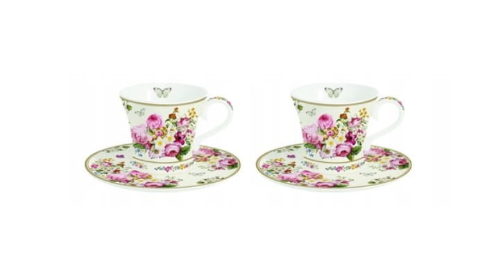 Przepięknej urody filiżanki ze spodkami do mocnej kawy espresso. Pochodzą z serii eleganckich naczyń użytkowych „Blooming opulence”. Wykonane są z wysokiej jakości porcelany kostnej w kolorze złamanej bieli i charakteryzują się niewielką wagą. Filiżanka posiada nadruk z motywem kolorowych kwiatów, identyczny wzór powtórzono na spodku. Przy rancie umieszczono dwa ozdobne złote paski. Szeroka stopka utrudnia przewracanie się filiżanki z napojem.
