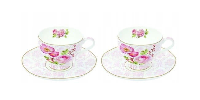Przepięknej urody filiżanki ze spodkami do mocnej kawy espresso. Pochodzą z serii eleganckich naczyń użytkowych „Blooming opulence”. Wykonane są z wysokiej jakości porcelany kostnej w kolorze złamanej bieli i charakteryzują się niewielką wagą. Filiżanka posiada nadruk z motywem kolorowych kwiatów, identyczny wzór powtórzono na spodku. Przy rancie umieszczono dwa ozdobne złote paski. Szeroka stopka utrudnia przewracanie się filiżanki z napojem.