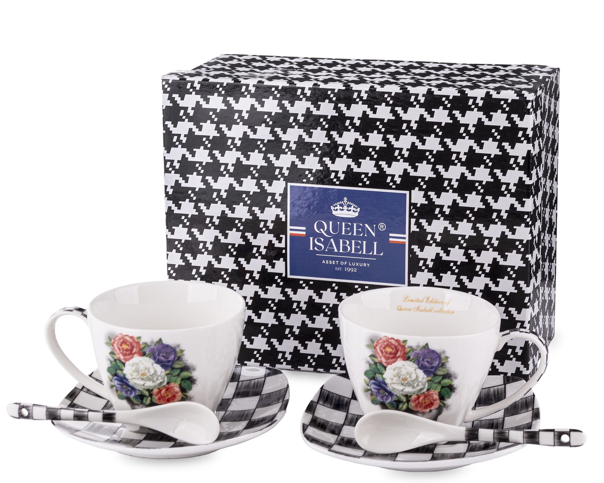 Przedstawiamy Państwu niezwykły zestaw filiżanek z talerzykami i łyżeczkami, Queen Isabell w eleganckim wzorze.Ten zestaw filiżanek jest doskonałym wyborem na wyjątkowy prezent dla osób, które cenią wyrafinowany styl i luksus. Każda filiżanka i talerzyk w tym zestawi e zostały starannie wykonane z najwyższej jakości porcelany, gwarantującej trwałość i elegancję. Niepowtarzalne wzornictwo nadaje filiżankom wyjątkowego charakteru oraz dodają im odrobiny blasku i prestiżu. Nasz zestaw filiżanek Queen Isabell nie tylko wyróżnia się estetyką i jakością, ale także jest prezentowany w wyjątkowym opakowaniu. To eleganckie pudełko o tym samym wzorze co na porcelanie jest idealne na prezent. Każdy element został starannie przemyślany, aby stworzyć niezapomnianą prezentację, która z pewnością zachwyci obdarowaną osobę. To wyjątkowe połączenie stylu, klasy i funkcjonalności sprawia, że zestaw filiżanek Queen Isabell jest idealnym prezentem na różne okazje: urodziny, rocznice, święta lub jako wyjątkowy upominek dla siebie samego.