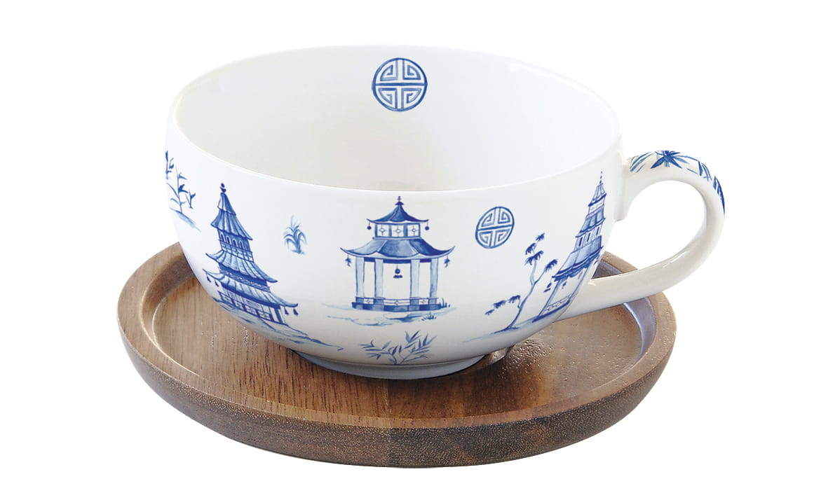 Filżanka pojedyncza 250 ml + podstawka akacjowa niebieski wzór minimalizm