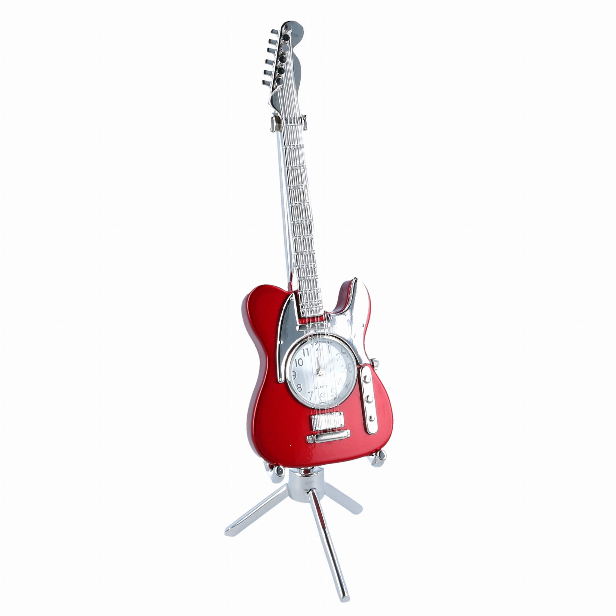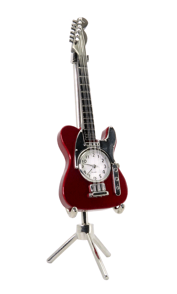 Elegancka gitara na stojaku w całości wykonano z metalu, charakteryzuje się dużą wytrzymałością i wysoką jakością. Dodatkowym atutem jest wbudowany zegar (zasilany baterią). Gitara jest wspaniałą ozdobą i dekoracją pokoju dla dziecka jak i dla dorosłej osoby. Może być dobrym pomysłem na udany prezent.