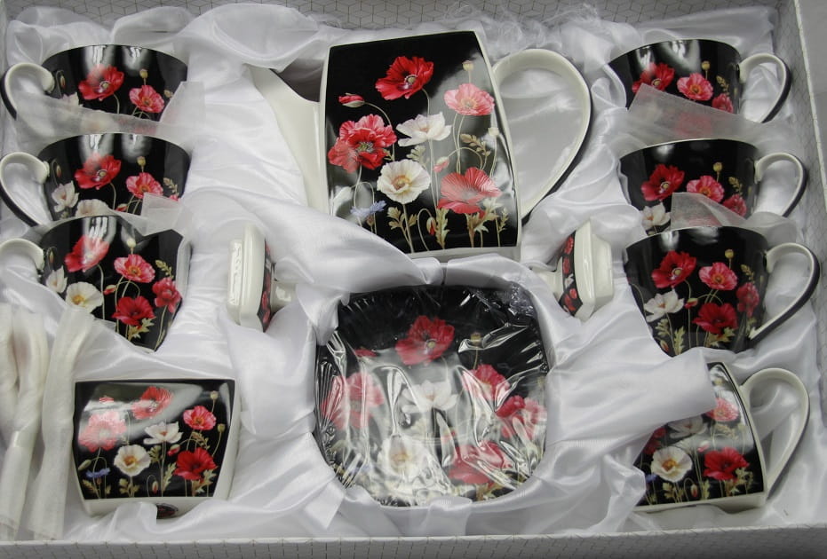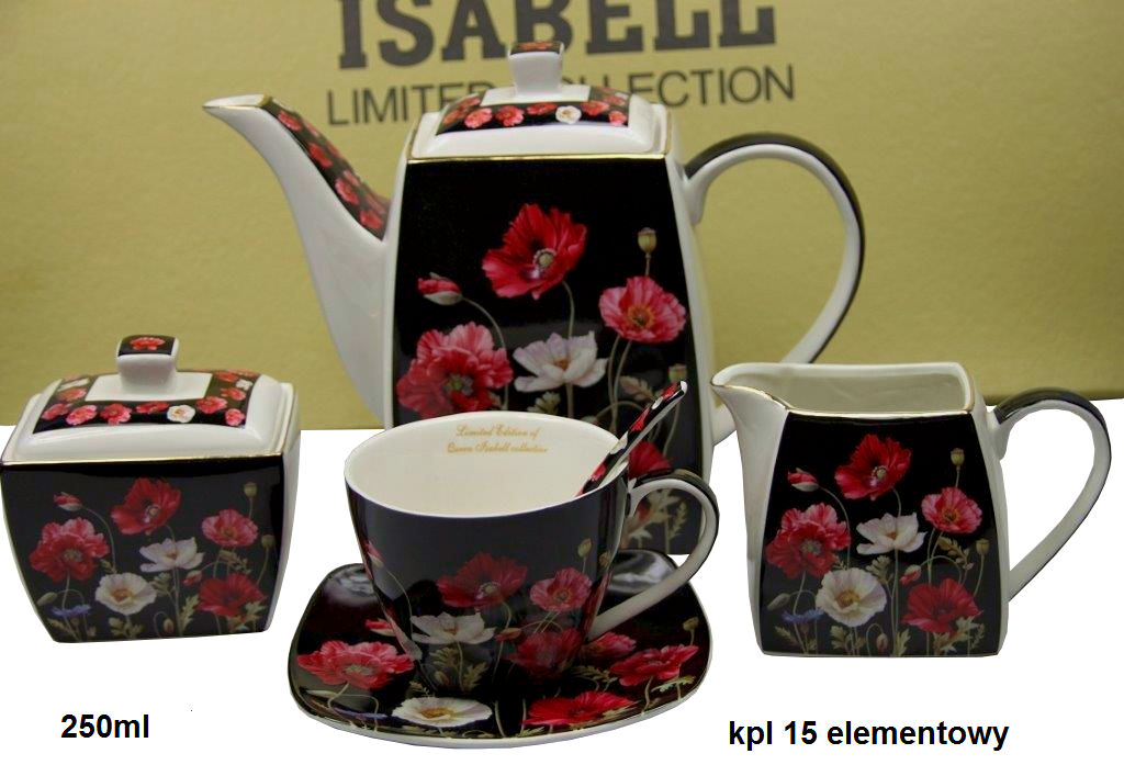 Zestaw do kawy składający się z 6 filiżanek, 6 podstawek, 6 łyżeczek, dzbanka, cukiernicy i mlecznika wykonany jest z najwyższej jakości porcelany kostnej Bone China. Ta wyjątkowa porcelana charakteryzuje się trwałością i eleganckim wyglądem, a także jest odporna na zarysowania i zmiany temperatury. Limitowana edycja "MAKI" dla firmy Queen Isabell zawiera piękne duże kwiaty czerwono-białych maków na czarnym tle, co dodaje szyku i elegancji każdej kawie. Zestaw jest pakowany w eleganckie pudełko, co czyni go idealnym prezentem dla bliskiej osoby lub jako dodatek do własnej kolekcji.
