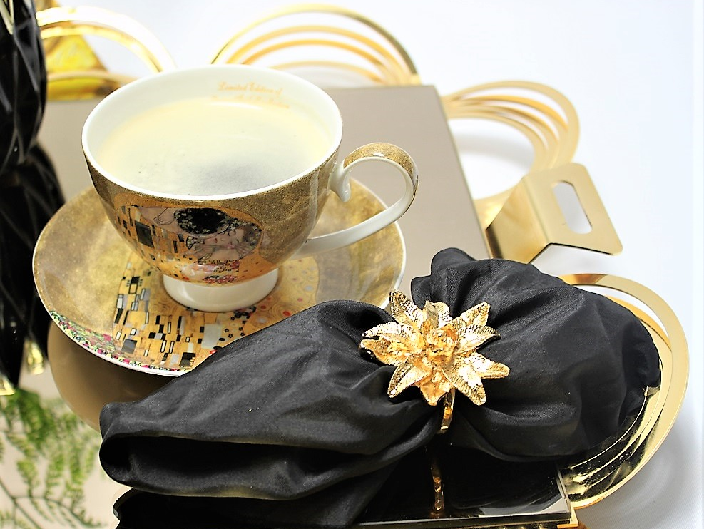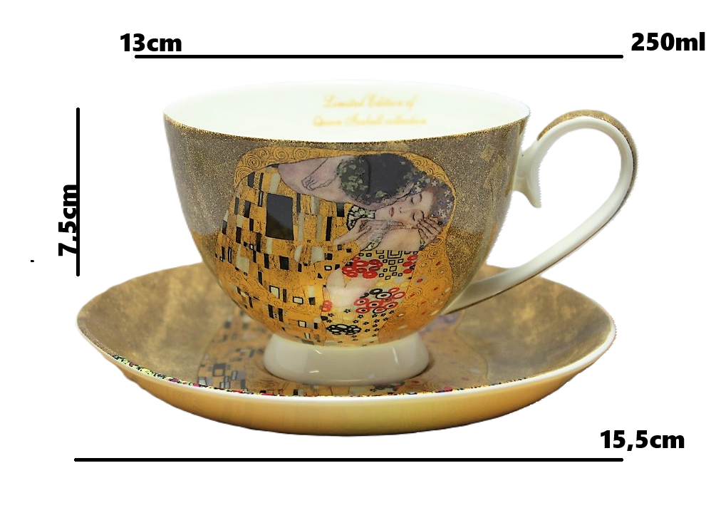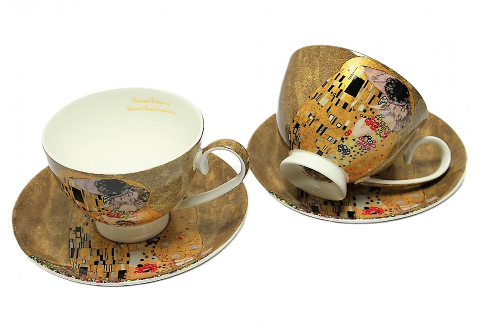 Komplet filiżanek dla dwojga z motywem obrazu „Pocałunek” Gustava Klimta. Ceramika z nadrukiem obrazów Klimta to ostatni krzyk mody – są bardzo popularne, wiele osób kolekcjonuje ceramikę z nadrukami Klimta. Ceramika z Klimtem, często jest również wybierana jako prezent na wiele okazji. Dołączone do kompletu ozdobne pudełko sprawia, że prezent jest już gotowy do przekazania od razu po jego zakupie.