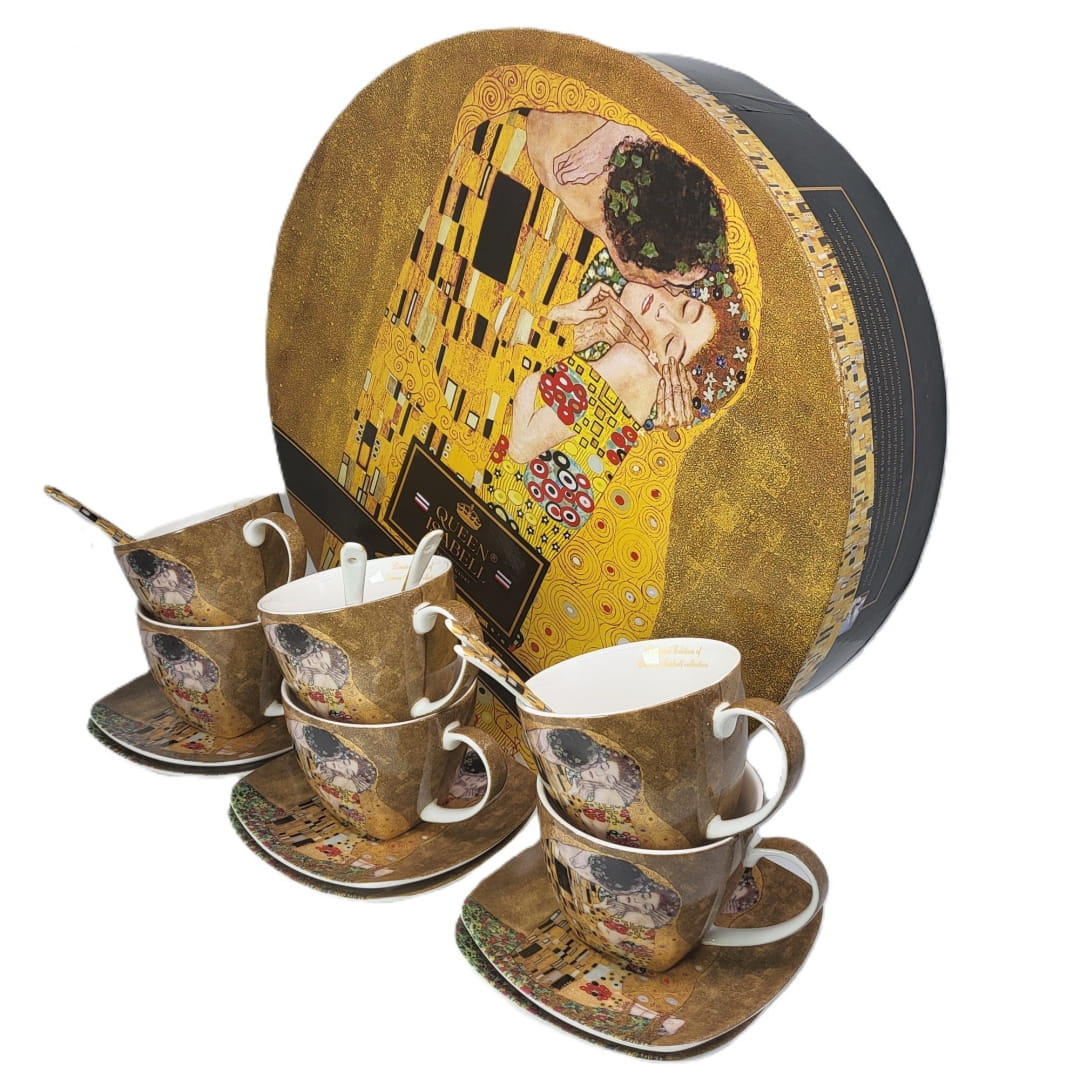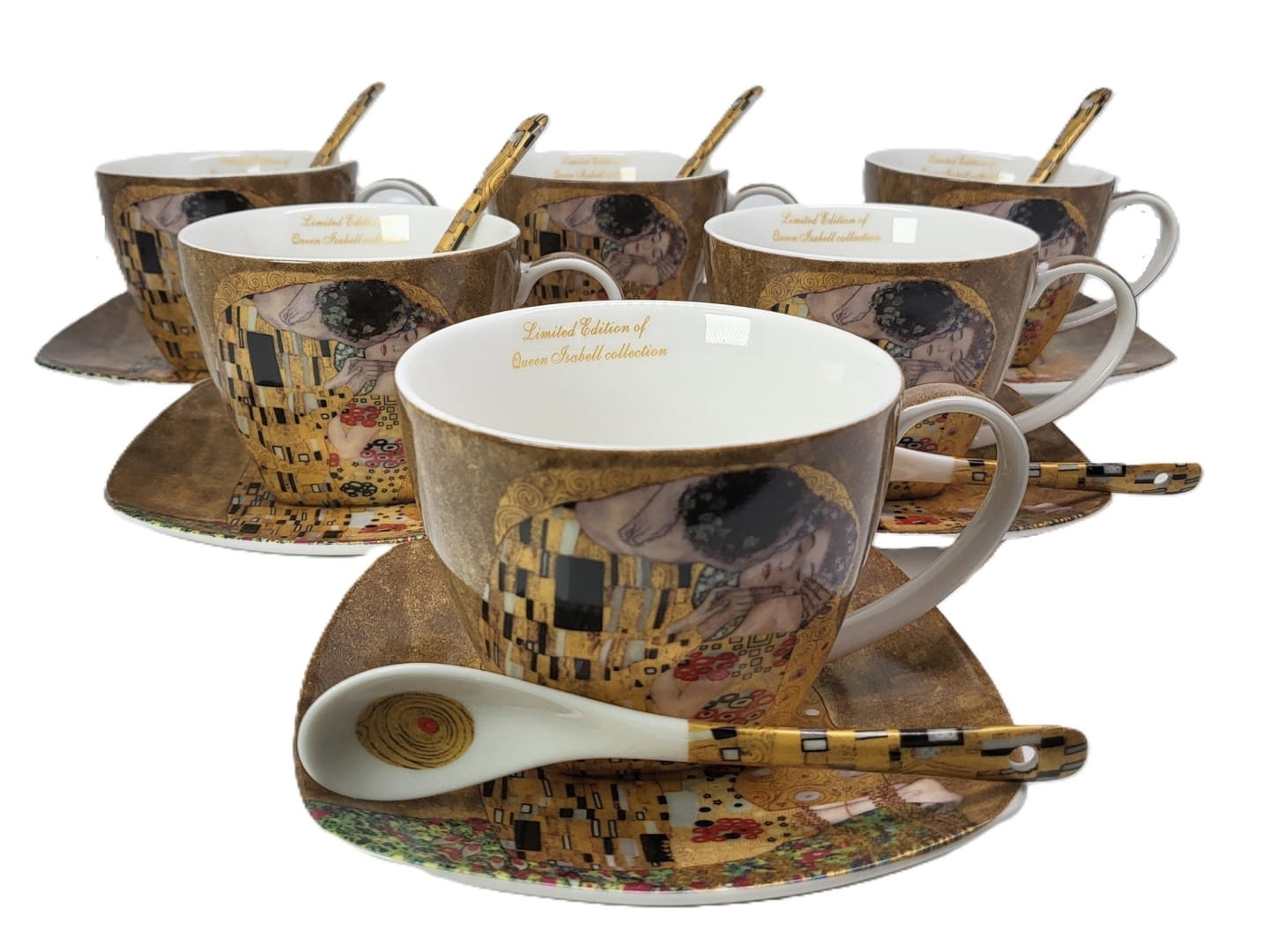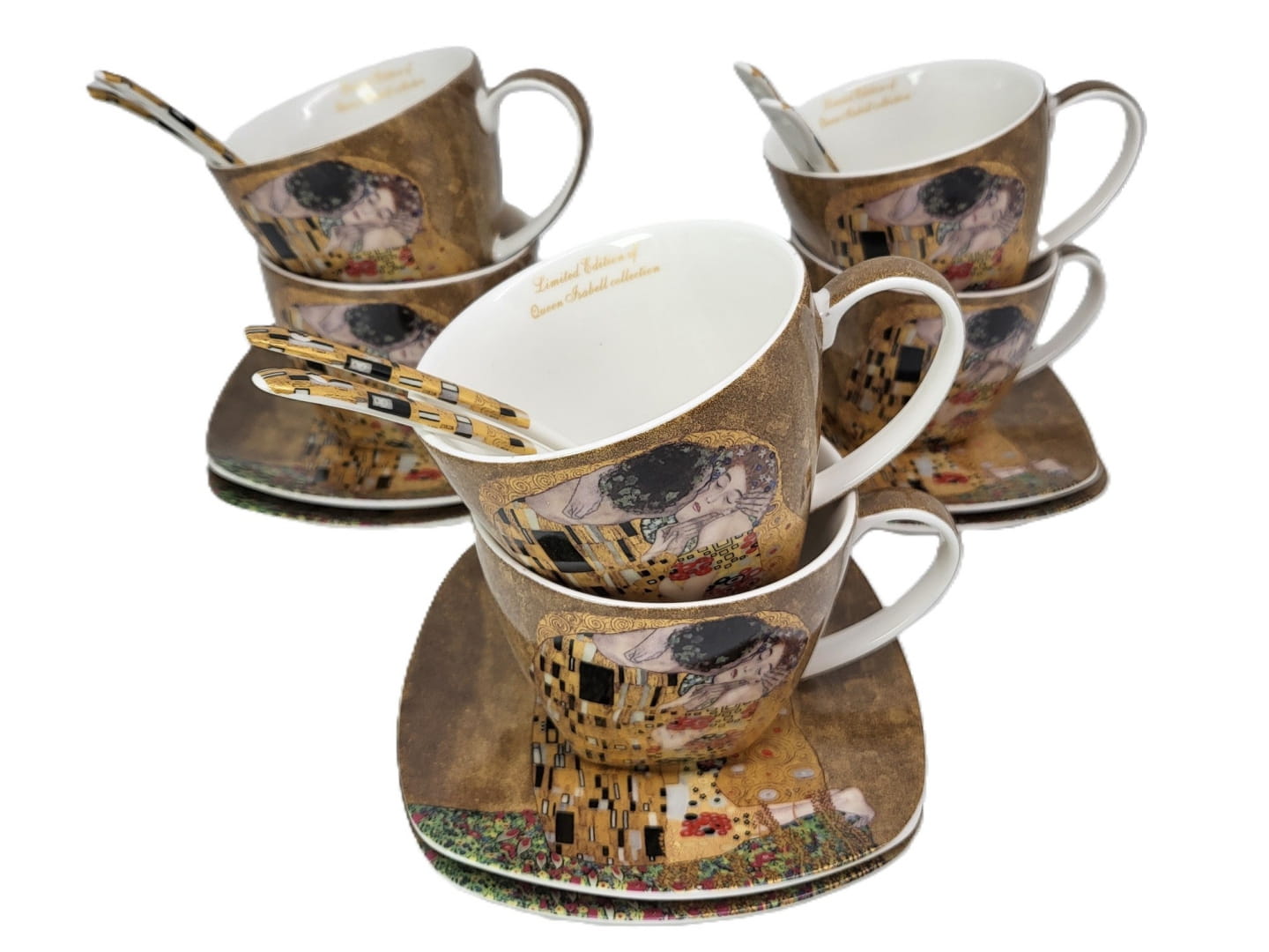 Komplet sześciu filiżanek, wykonany z wysokiej jakości porcelany. Zewnętrzną część filiżanek oraz spodków ozdobiono nadrukiem, motywem ze słynnego obrazu Pocałunek, mistrza pędzla Gustava Klimta. Każdy element zestawu wykonano z największą starannością. Prezentowany komplet zapakowany jest w opakowanie z identycznym motywem na wieczku.