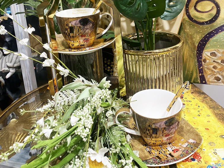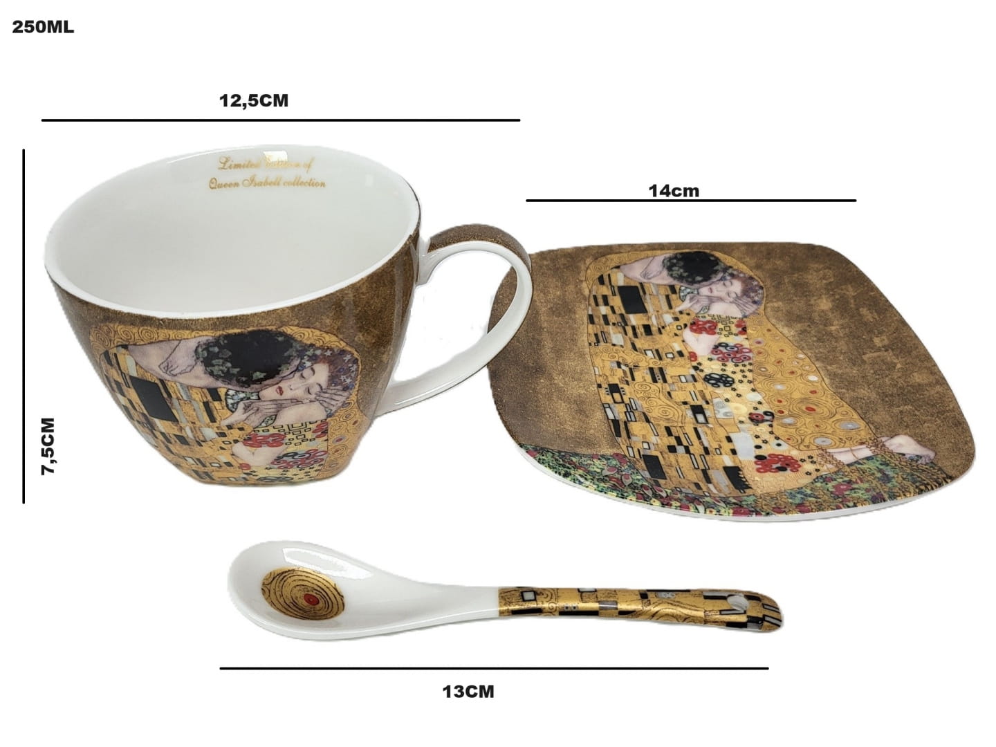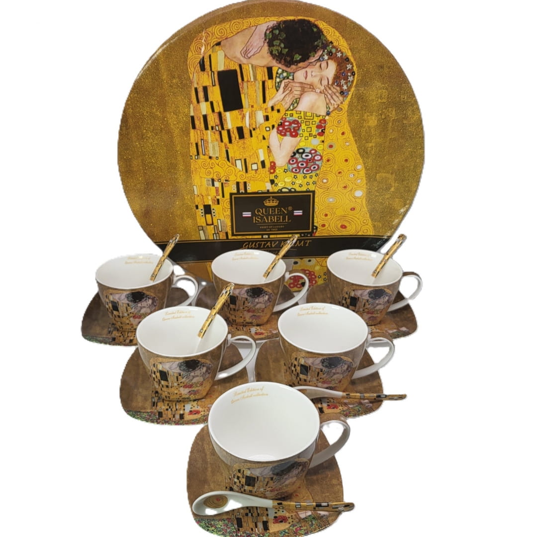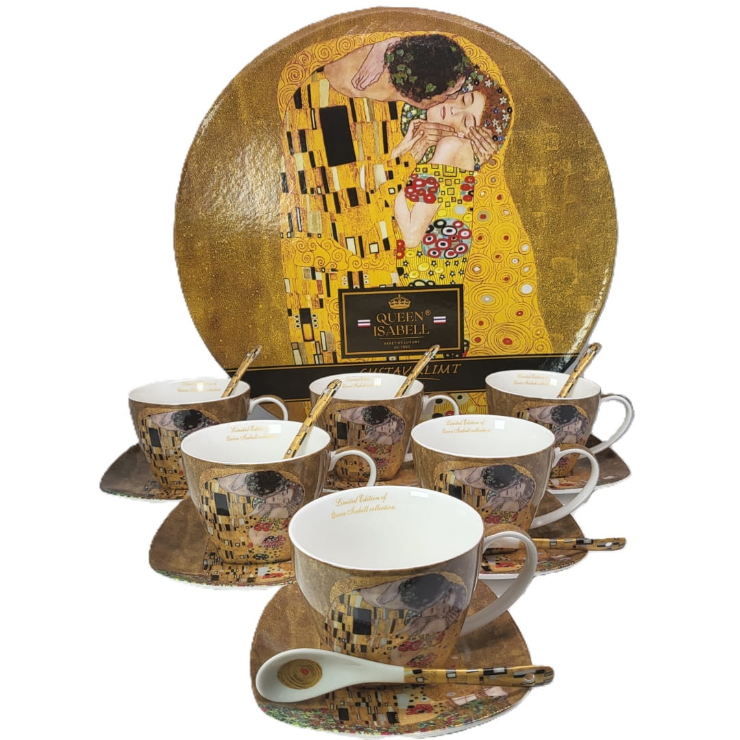 Komplet sześciu filiżanek, wykonany z wysokiej jakości porcelany. Zewnętrzną część filiżanek oraz spodków ozdobiono nadrukiem, motywem ze słynnego obrazu Pocałunek, mistrza pędzla Gustava Klimta. Każdy element zestawu wykonano z największą starannością. Prezentowany komplet zapakowany jest w opakowanie z identycznym motywem na wieczku.