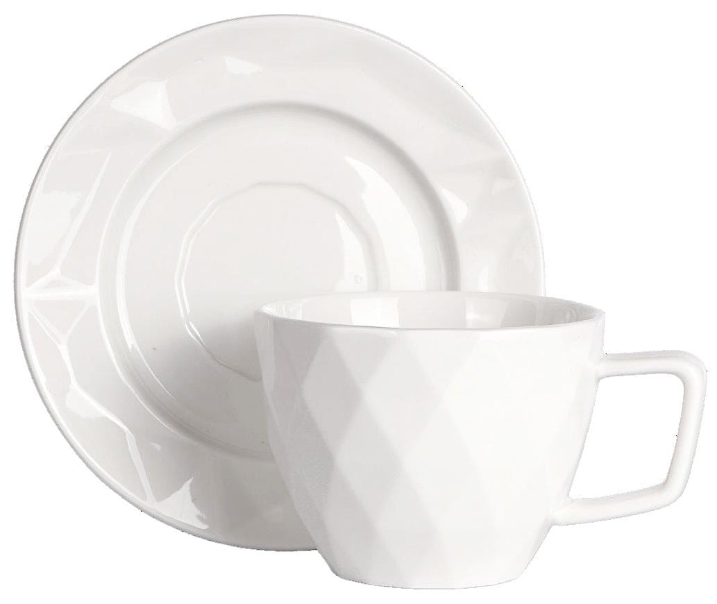 Komplet z wyrafinowanym tłoczeniem w romby oraz okrągłym spodkiem. Wykonane z najwyższej jakości porcelany new bone china renomowanej marki Veroni. Wszystko zapakowane w ozdobne opakowanie (może się różnić w zależności od dostawy).