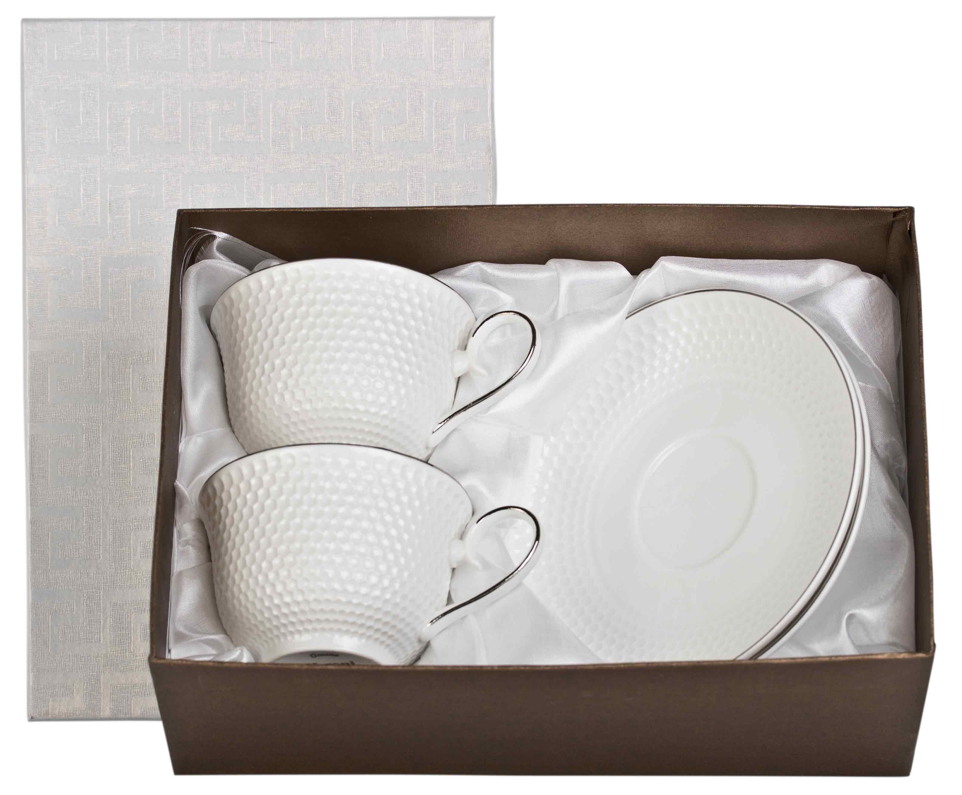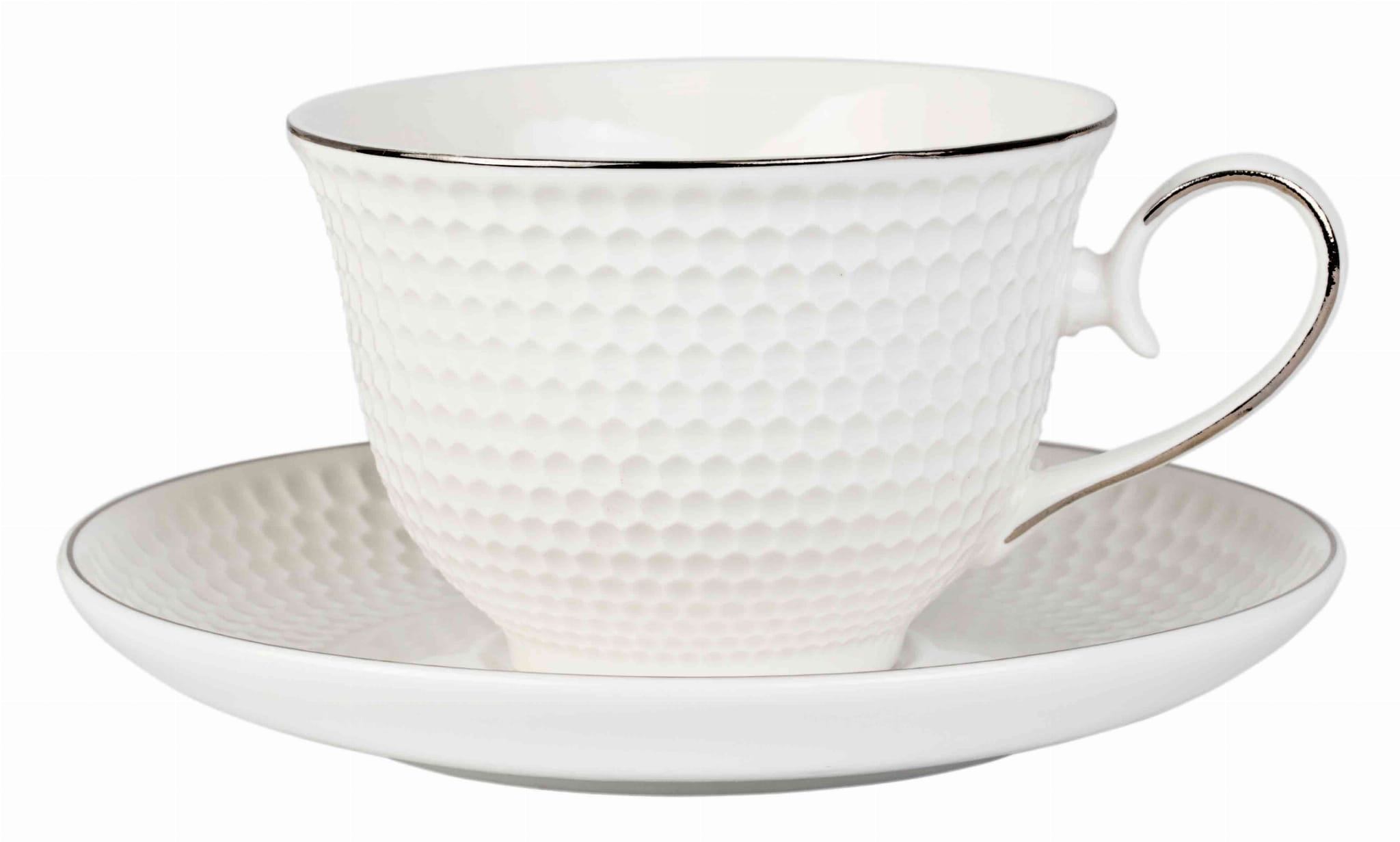 Filiżanki których ozdobą jest wypukły relief w formie plastru miodu oraz srebne wykończenie. Wykonane z najwyższej jakości porcelany new bone china renomowanej marki Veroni. Wszystko zapakowane w ozdobne opakowanie (może się różnić w zależności od dostawy).