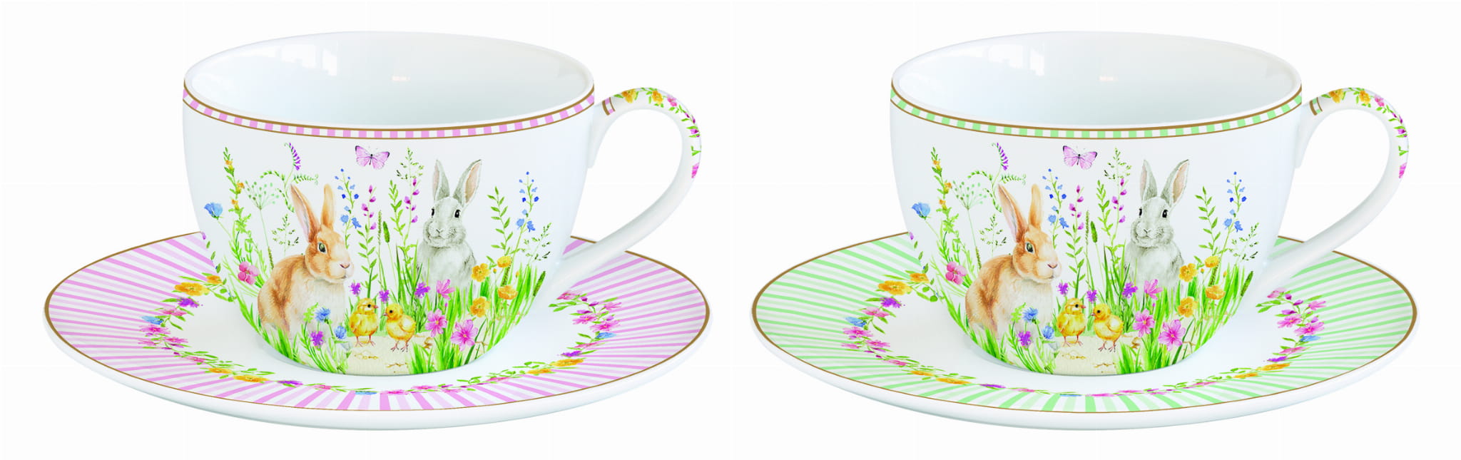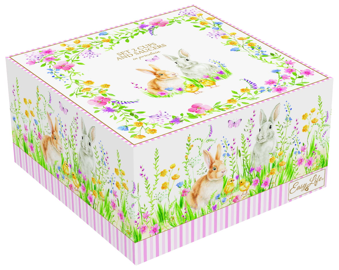 Stwórz wyjątkową atmosferę podczas porannej kawy lub popołudniowej herbaty z kompletem dwóch filiżanek porcelanowych o pojemności 240ml. Ich delikatne wzory z króliczkami, kurczaczkami i wiosennymi kwiatami dodają uroku i świątecznego klimatu, a złote akcenty podkreślają elegancję. Każda filiżanka ma dopasowany spodek z subtelnym paskowanym wzorem, tworząc harmonijną całość.