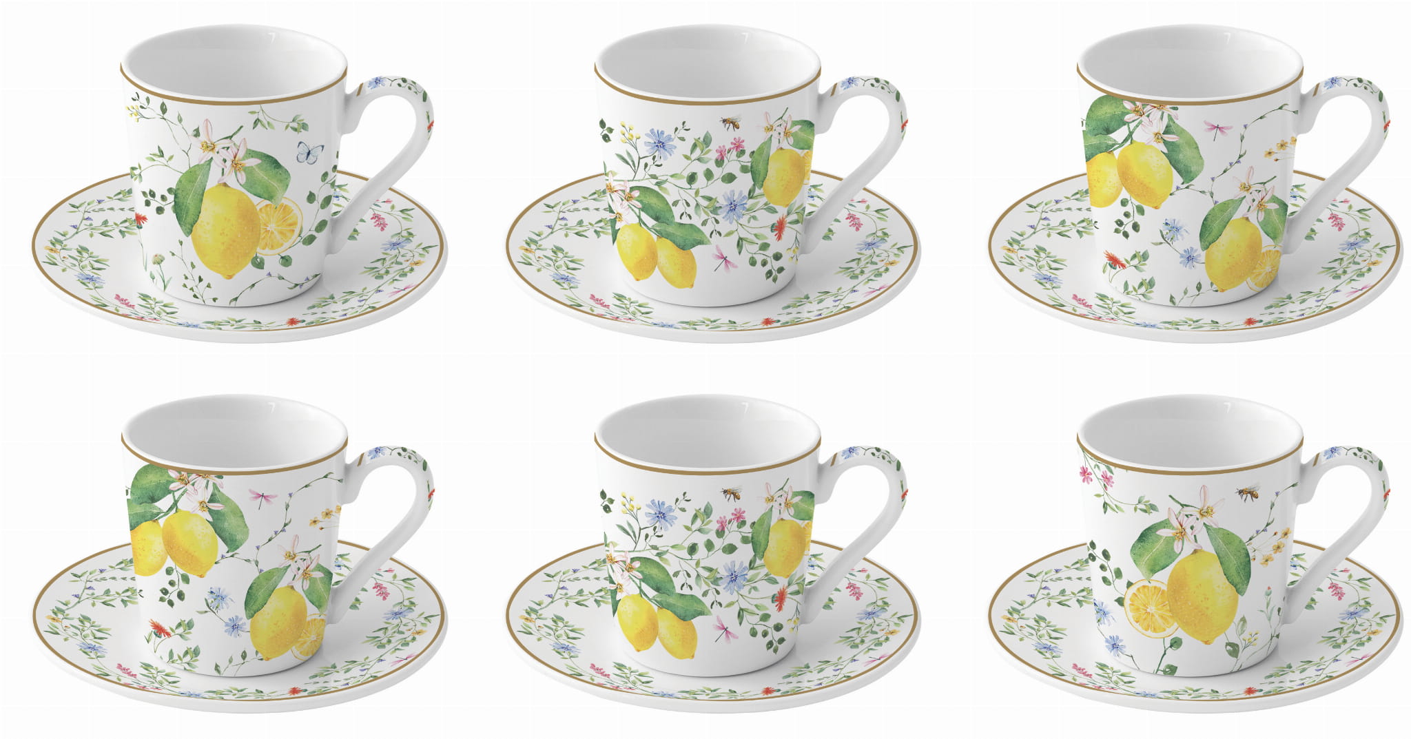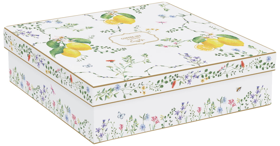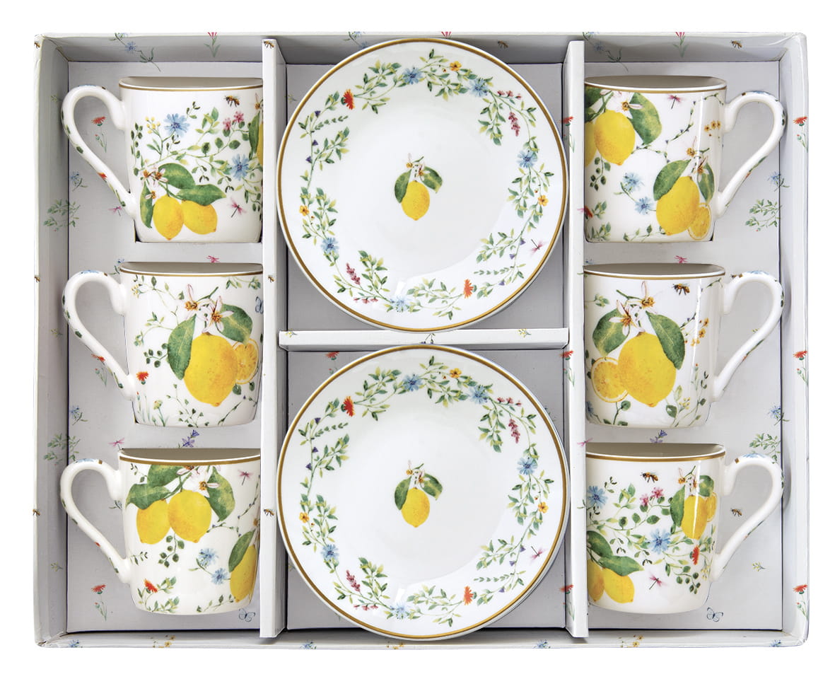 Przenieś się do słonecznej Italii z każdym łykiem ulubionej kawy! Ten wyjątkowy komplet 6 filiżanek z porcelany o pojemności 100 ml to doskonałe połączenie funkcjonalności i romantycznego stylu. Każda filiżanka wraz ze spodkiem ozdobiona jest akwarelowym motywem soczystych cytryn, delikatnych kwiatów, liści oraz owadów – w tym pszczółek, motyli i ważek – co nadaje całości subtelnego, botanicznego uroku. Złote obramowanie dodaje szyku, a eleganckie opakowanie sprawia, że zestaw idealnie sprawdzi się jako prezent.