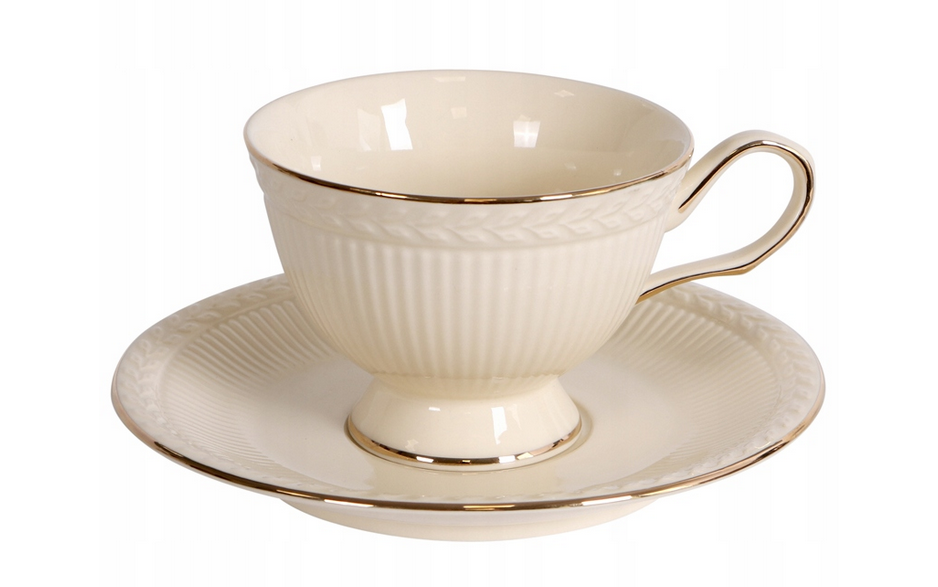 Filiżanki ze złotym zdobieniem i finezyjnymi żłobieniami. Wykonane z najwyższej jakości porcelany renomowanej marki Veroni. Wszystko zapakowane w ozdobne opakowanie (może się różnić w zależności od dostawy).