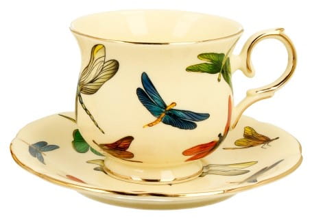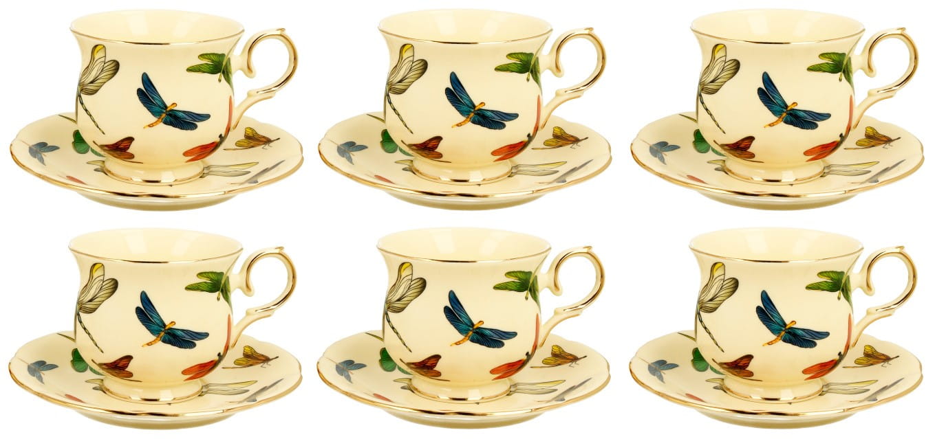 Komplet filiżanek zdobiony eleganckimi, kolorowymi ważkami ze złotymi wykończeniami. Wykonane z najwyższej jakości porcelany. Wszystko zapakowane w ozdobne opakowanie.