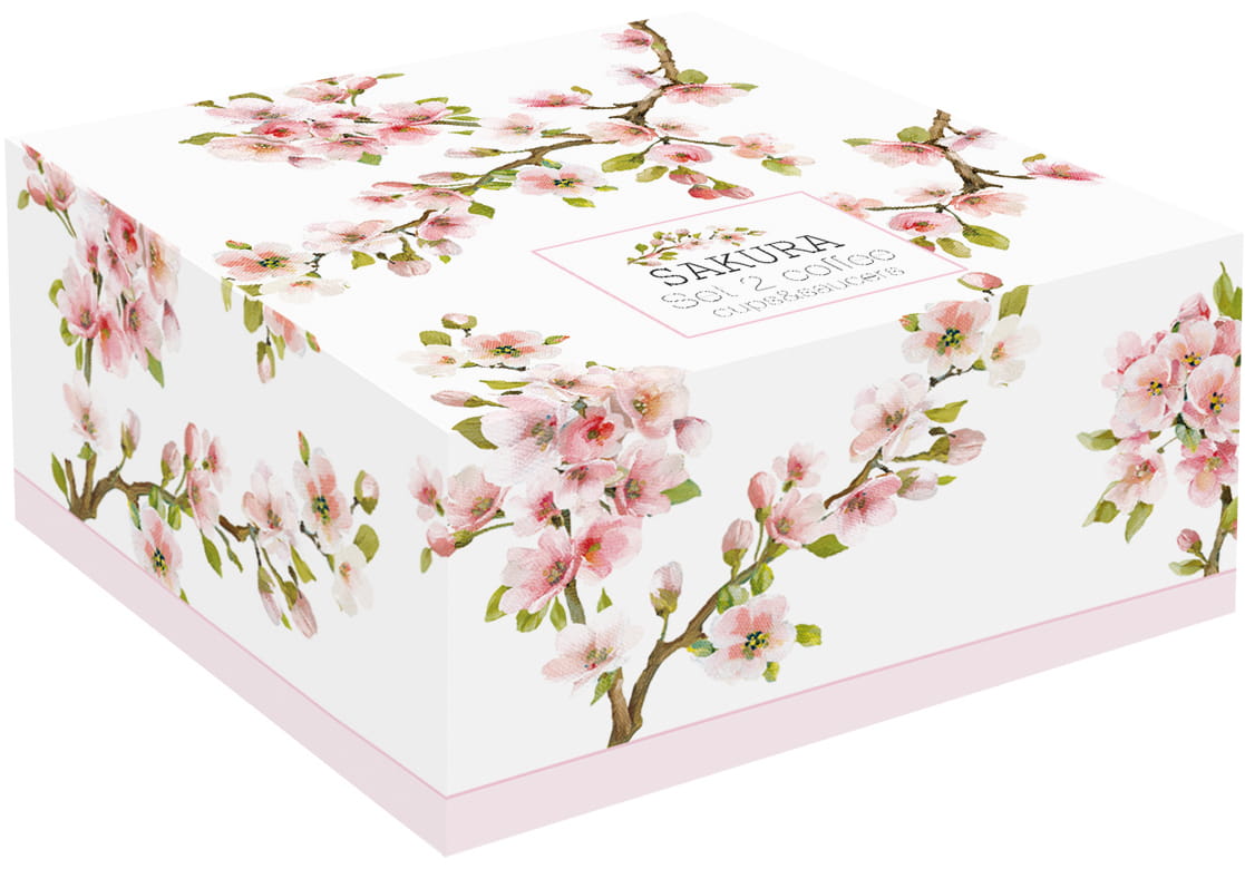 Filiżanki wykonano z ceramiki porcelanowej zachwycają modnym motywem pięknych kwitnących gałęzi drzewa owocowego.Dodatkowo do filiżanek dołączono drewniane podstawki. Filiżanki umieszczono w eleganckim pudełku, posiadający ten sam wzór. Świetnie sprawdzi się jako prezent na wiele okazji.