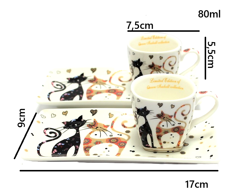 Filiżanki do espresso z kolekcji Queen Isabell to unikalny i luksusowy produkt wyprodukowany z najwyższej jakości porcelany kostnej bone china. Ten wyjątkowy materiał, znany ze swojej lekkości i przezroczystości, jest ręcznie formowany i wypalany w specja lnych piecach, aby zapewnić najlepszą jakość i trwałość. Wersja limitowana filiżanki zachwyca motywem zakochanych się kotów, który dodaje jej charakteru i uroku. Ciesz się wyjątkowym doświadczeniem picia espresso z tej eleganckiej i trwałej filiżanki, stw orzonej z myślą o najbardziej wymagających gościach.