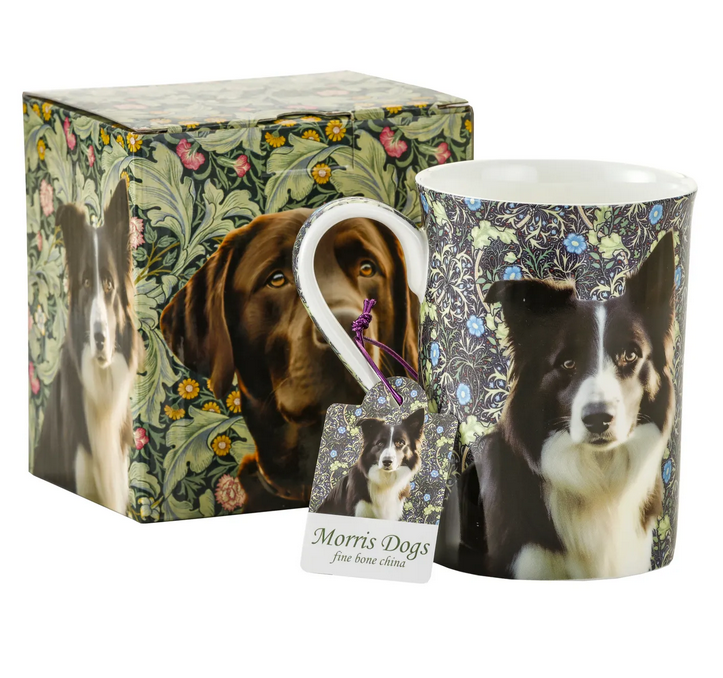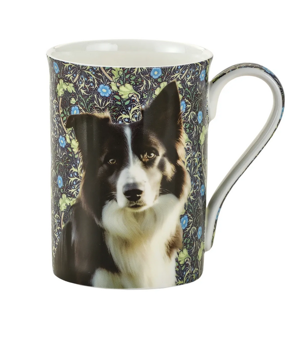 Na froncie kubka zachwyca realistyczny portret Border Collie – jednej z najbardziej inteligentnych i pracowitych ras. Otoczenie to artystyczne, florystyczne tło inspirowane dziełami Williama Morrisa – klasyka stylu arts & crafts, który nadaje kubkowi unikalny, dekoracyjny charakter.