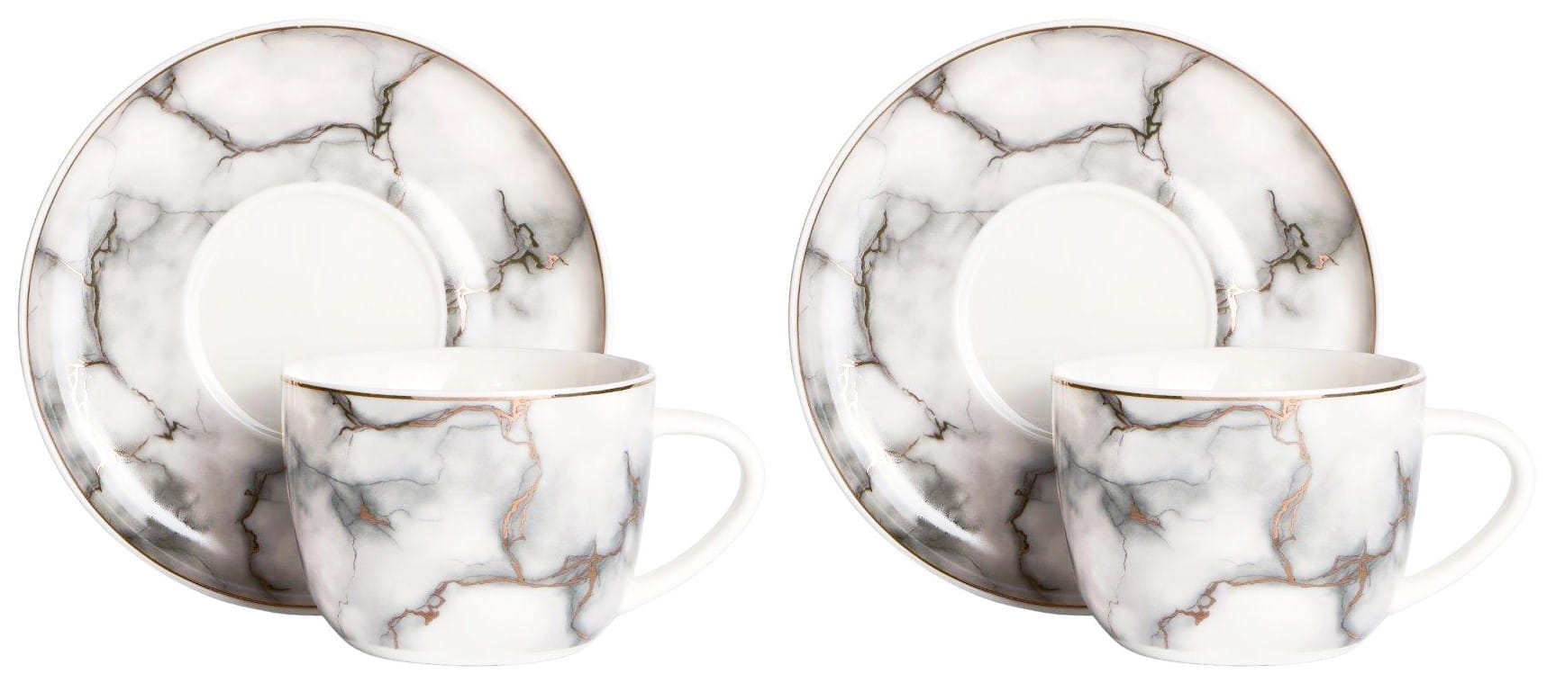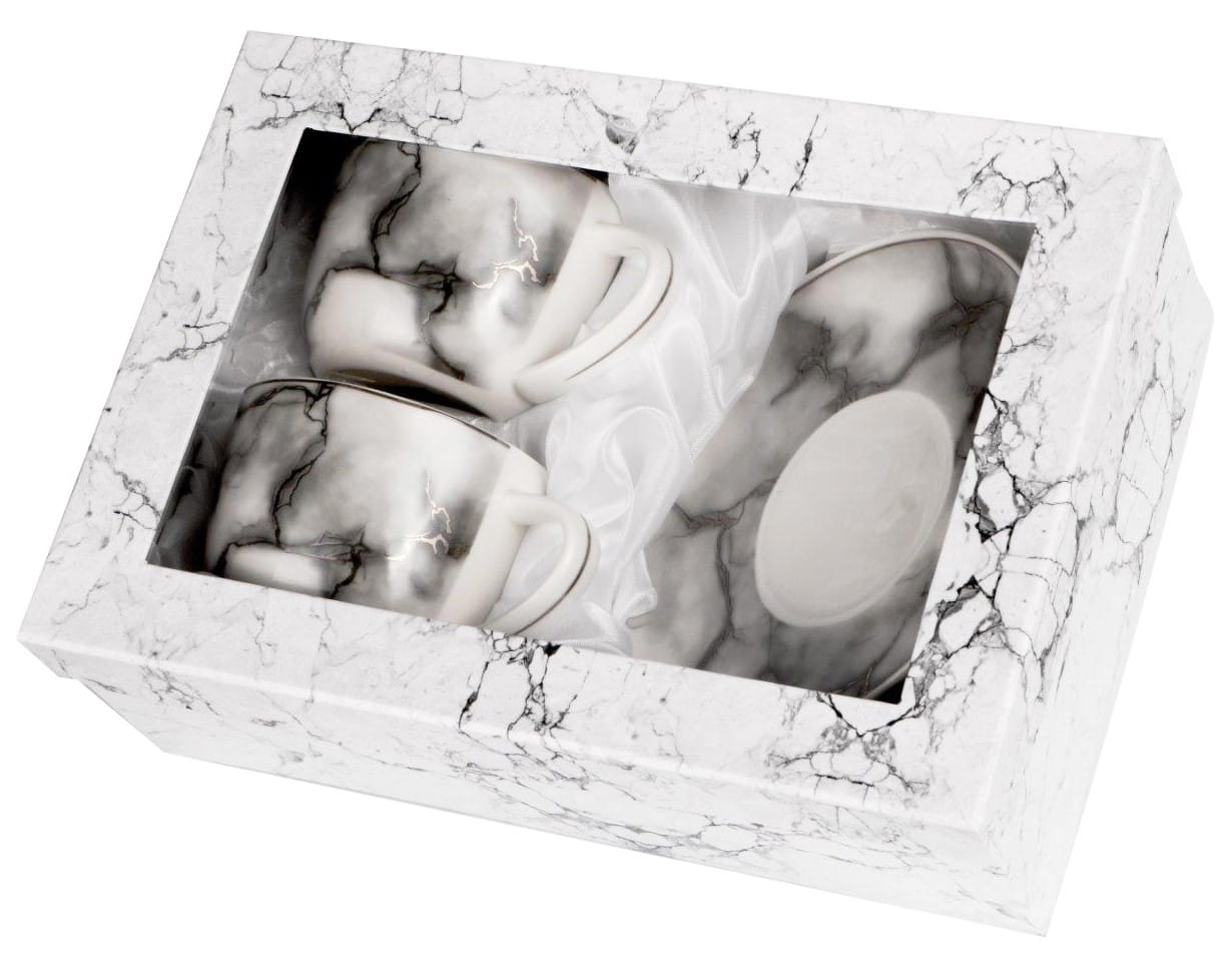 Komplet z marmurkowymi nadrukami oraz złotymi zdobieniami i obrzeżami. Wykonane z najwyższej jakości porcelany new bone china renomowanej marki Veroni. Wszystko zapakowane w ozdobne opakowanie (może się różnić w zależności od dostawy).