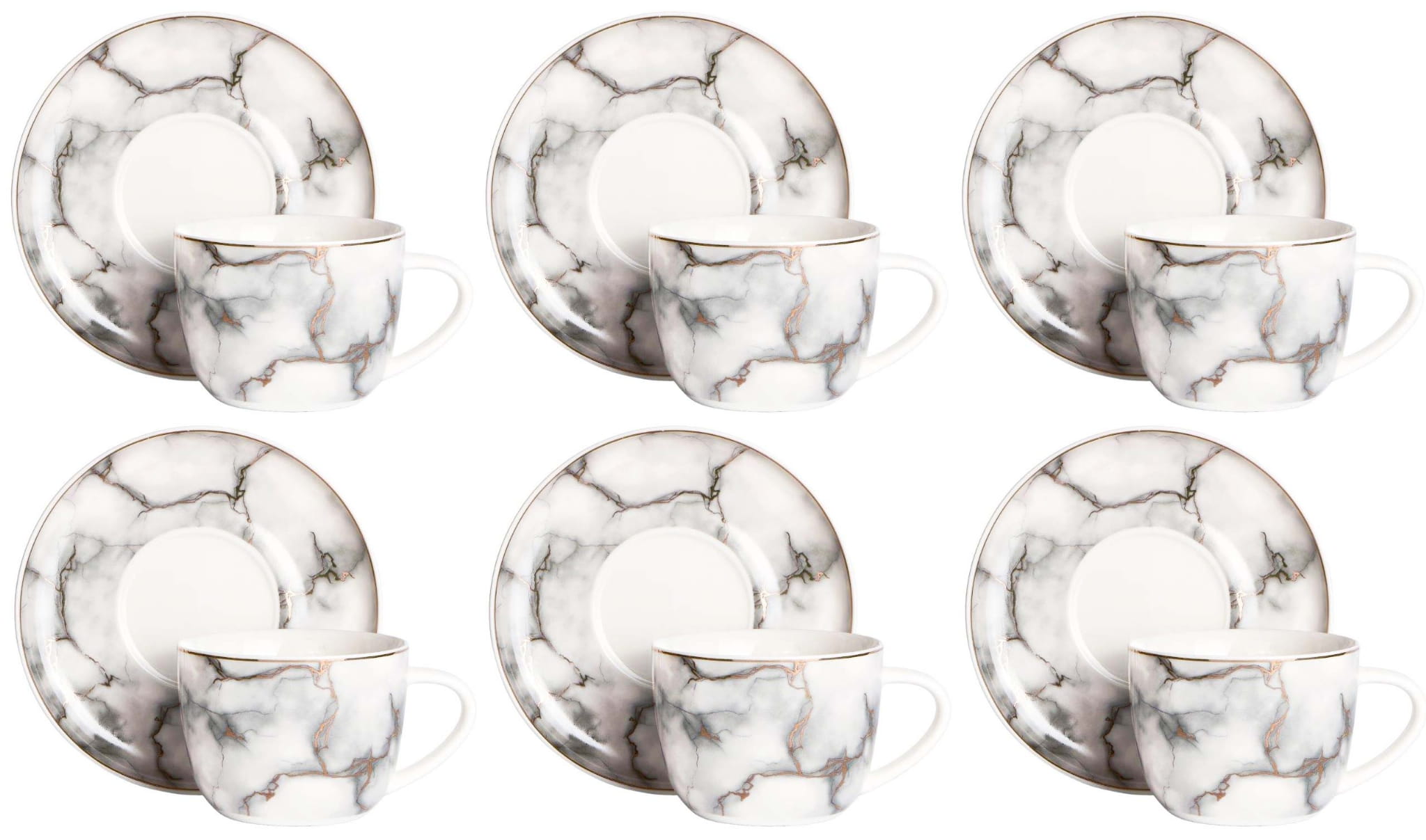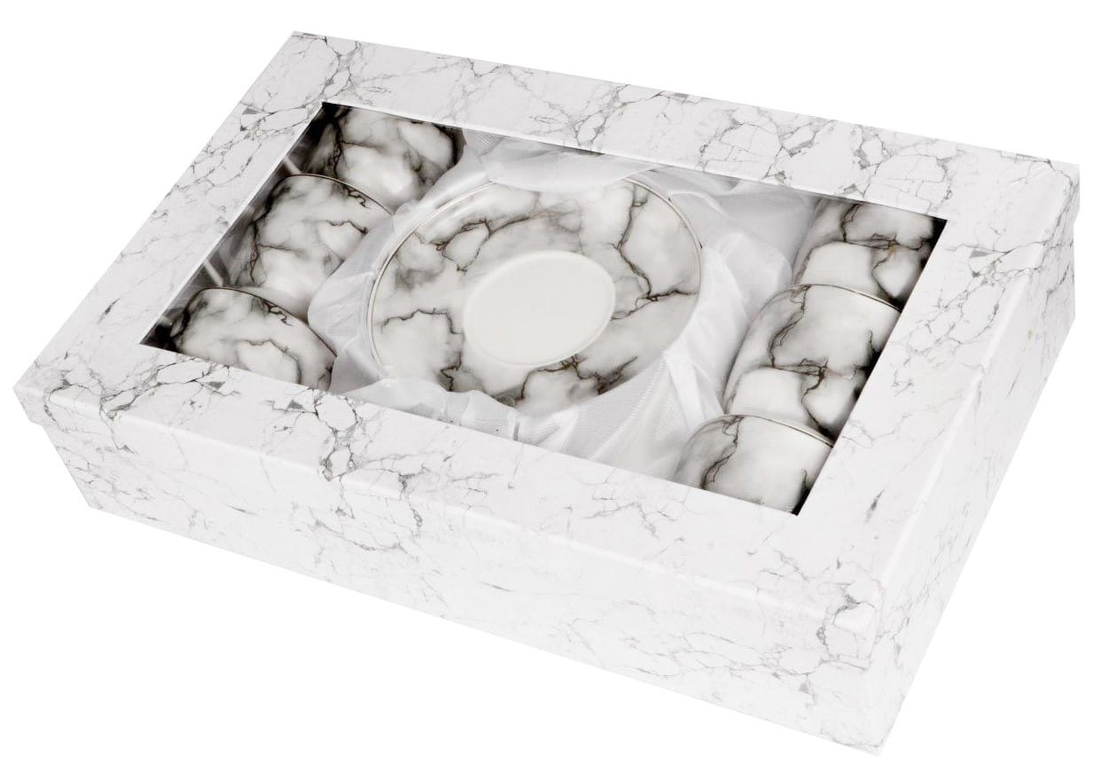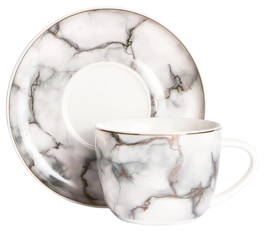 Komplet z marmurkowymi nadrukami oraz złotymi zdobieniami i obrzeżami. Wykonane z najwyższej jakości porcelany new bone china renomowanej marki Veroni. Wszystko zapakowane w ozdobne opakowanie (może się różnić w zależności od dostawy).