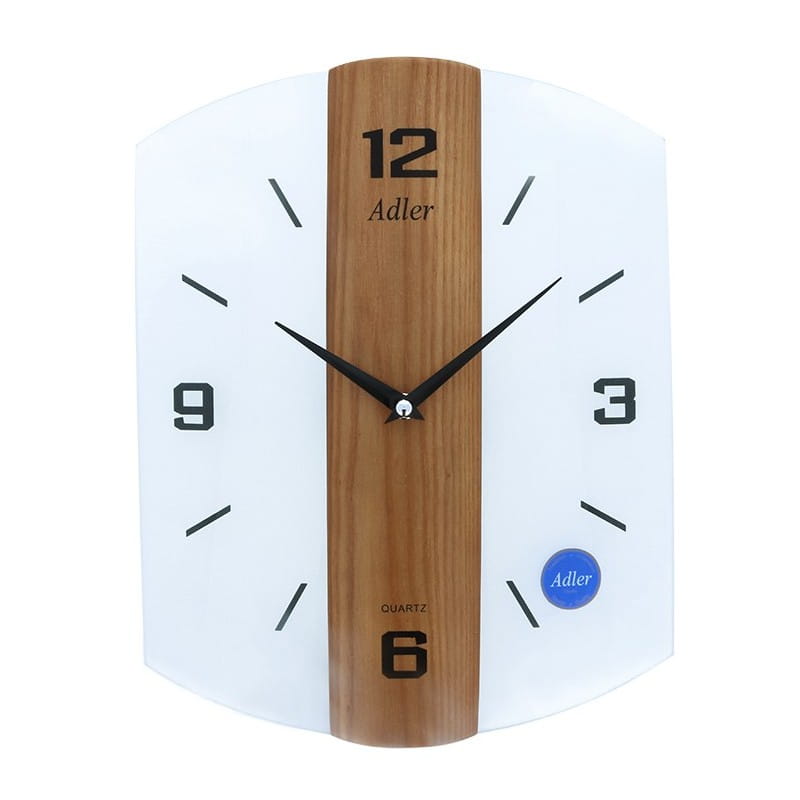 Zegar do zawieszenia na ścianie skonstruowany w pracowni marki Adler. Ciekawie łączy w sobie klasykę (drewno) i nowoczesność (szkło).