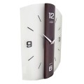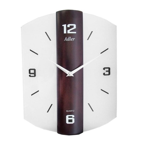 Nowoczesny zegar ścienny zasilany na baterię, uznanej marki Adler. Zegar wykonano ze szkła i drewna. Drewno wybarwiono na kolor orzech. Uwagę zwraca ciekawa kompozycja łącząca klasykę i nowoczesność. Godziny zaznaczono za pomocą indeksów i cyfr arabskich. Tarcza jest duża i wyraźna - doskonale widoczna z dużej odległości.