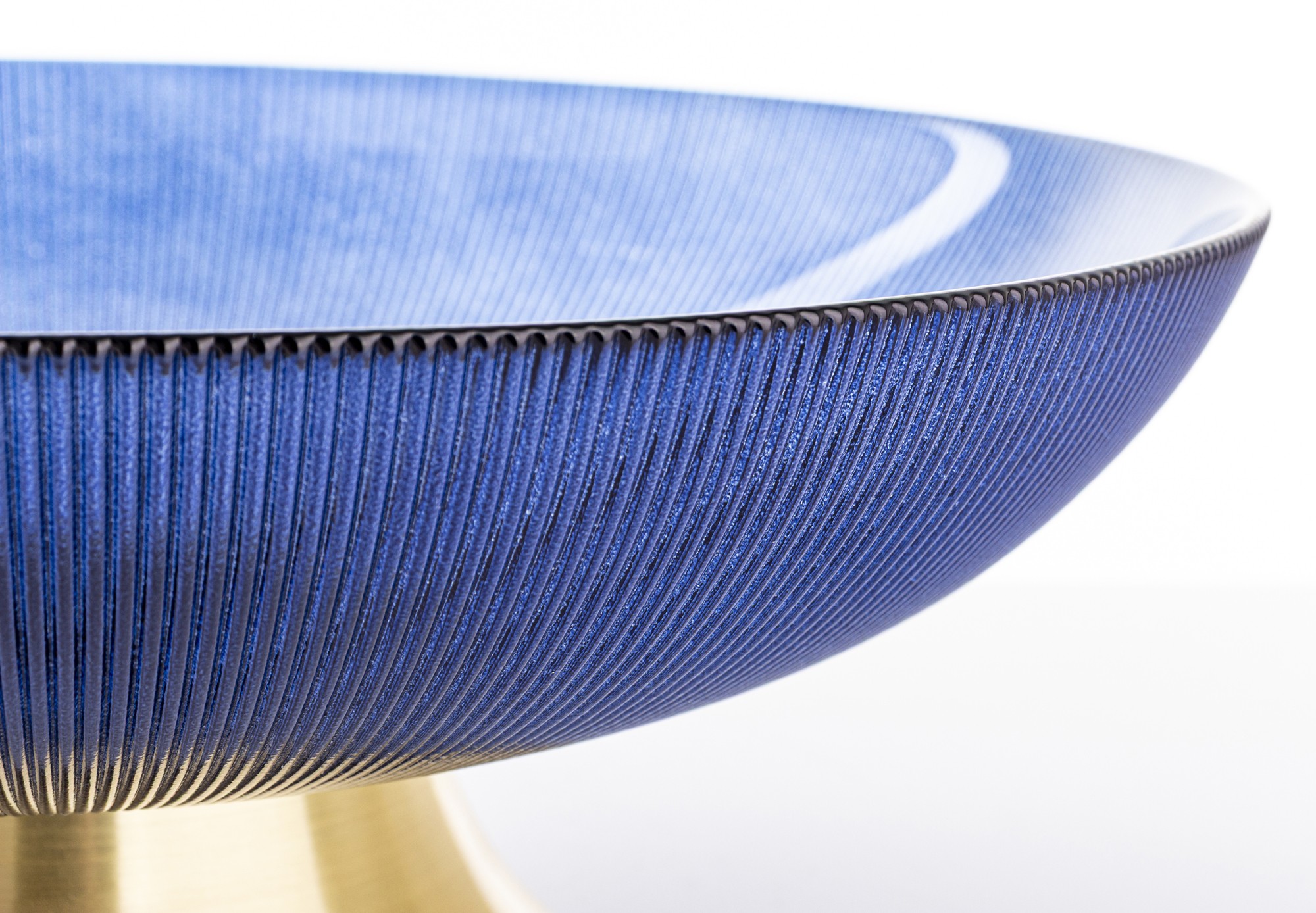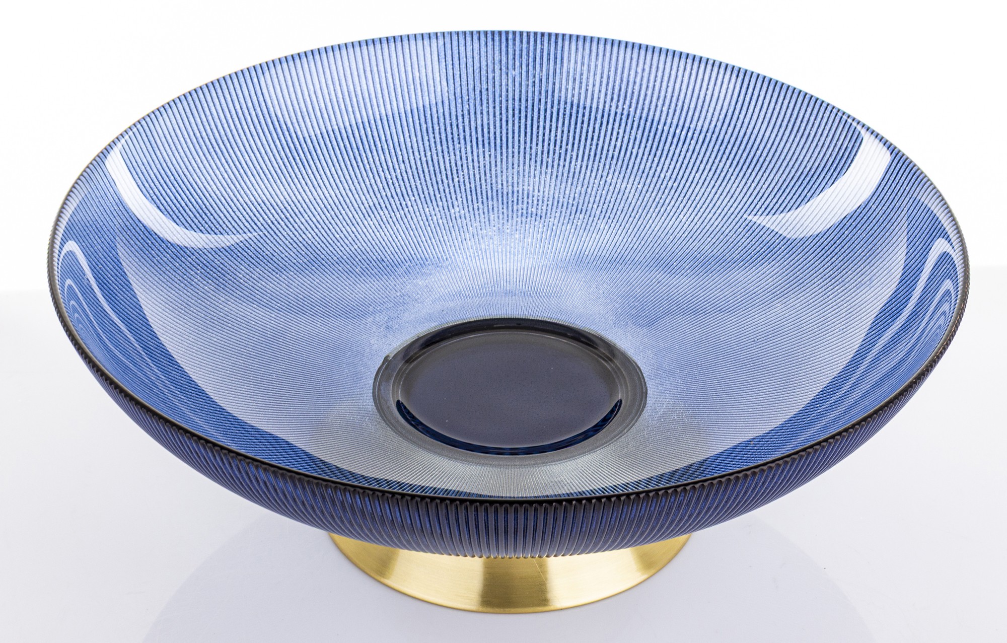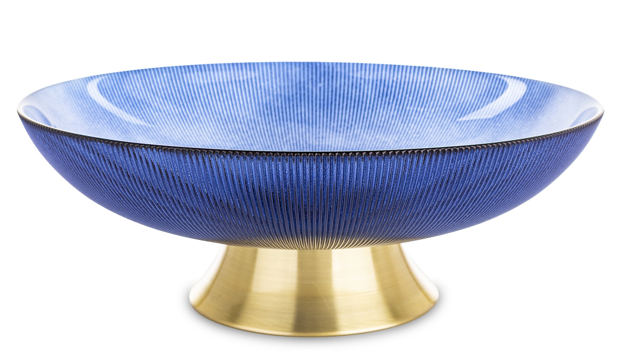 Dzięki imponującym wymiarom 12,5 x 35,5 x 35,5 cm patera stanowi wyrazisty akcent dekoracyjny na stole, komodzie lub wyspie kuchennej. Jej szeroka czasza o subtelnie ryflowanej strukturze pięknie rozprasza światło, podkreślając głębię koloru oraz nadając całości luksusowego charakteru. Złota podstawa dodaje elegancji i zapewnia stabilność, jednocześnie kontrastując z chłodnym odcieniem szkła.