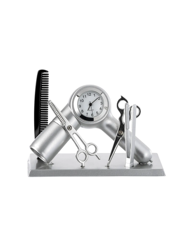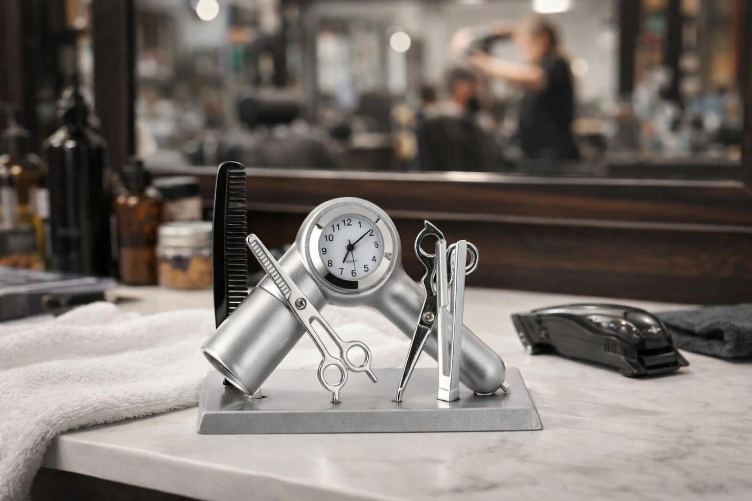 Stylowy zegar dekoracyjny – przybory fryzjerskie (9,9 × 5,7 × 7,3 cm)
