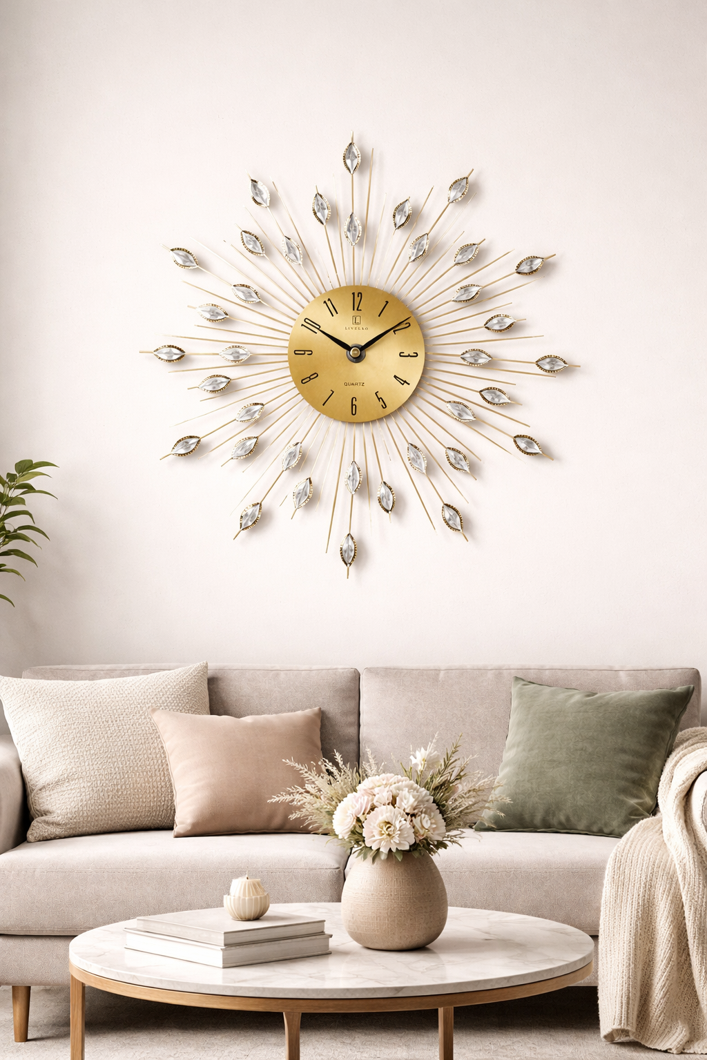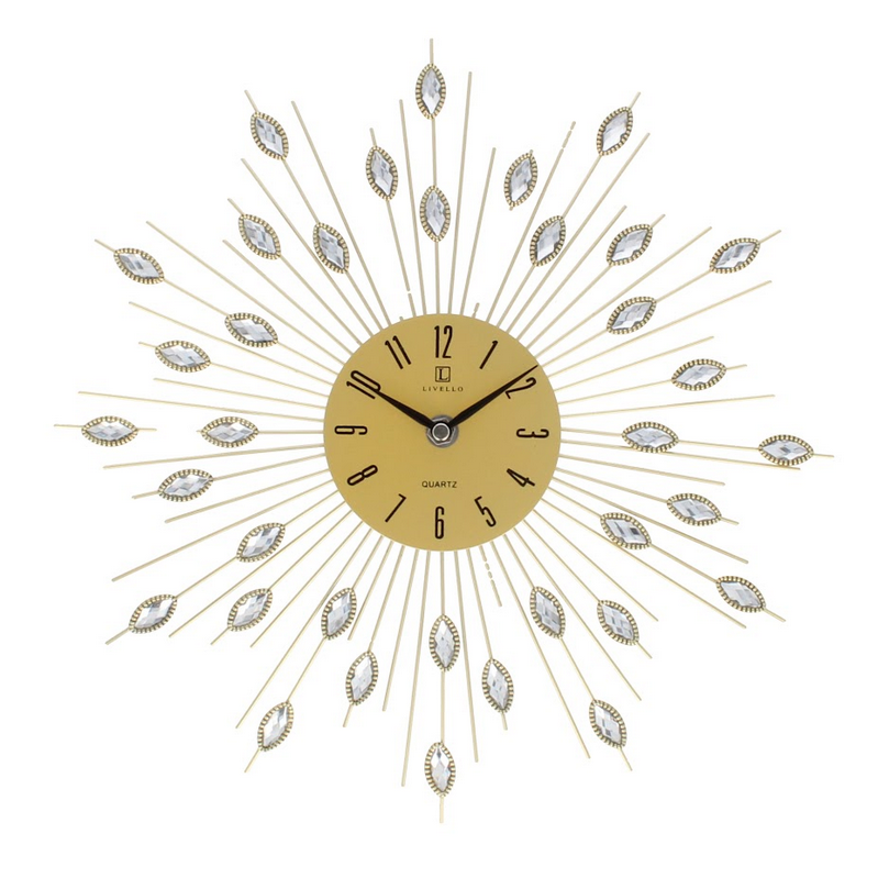 Centralną część zegara stanowi złota tarcza z czytelnymi czarnymi cyframi, która gwarantuje wygodne odczytywanie godziny. Od niej promieniście rozchodzą się cienkie, metalowe ramiona zakończone dekoracyjnymi elementami przypominającymi kryształowe liście. Te połyskujące detale pięknie odbijają światło, dodając wnętrzu blasku i elegancji.