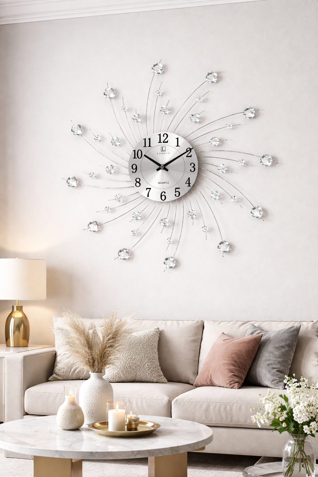 Zegar wyróżnia się nowoczesną, promienistą konstrukcją, w której smukłe metalowe ramiona rozchodzą się wokół centralnej tarczy niczym delikatne promienie. Na ich końcach umieszczono lśniące kryształowe zdobienia, które pięknie odbijają światło i nadają całości luksusowego blasku. Dzięki temu zegar przyciąga uwagę i doskonale komponuje się z eleganckimi, glamour oraz nowoczesnymi aranżacjami wnętrz.