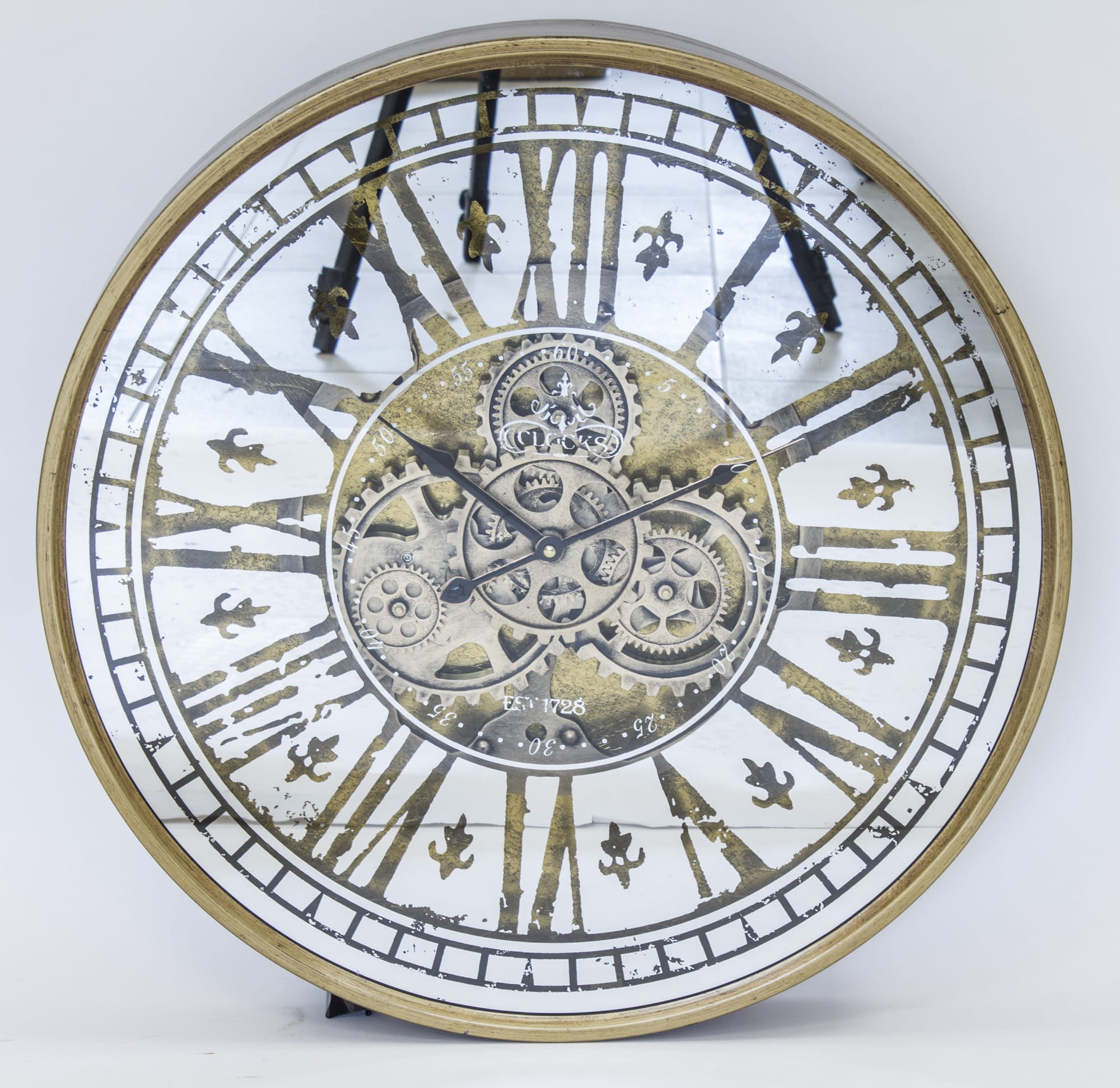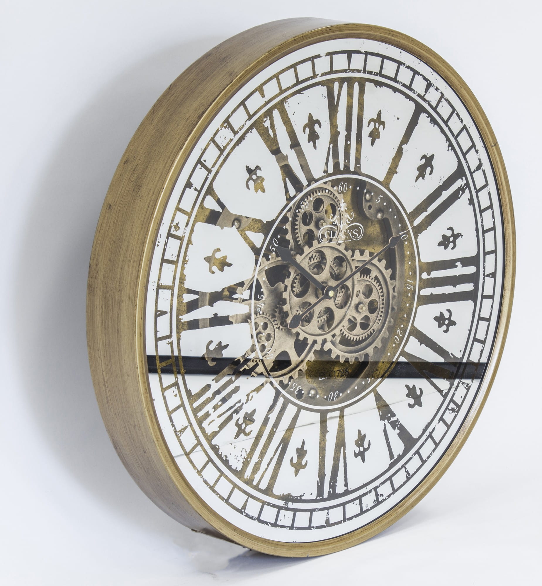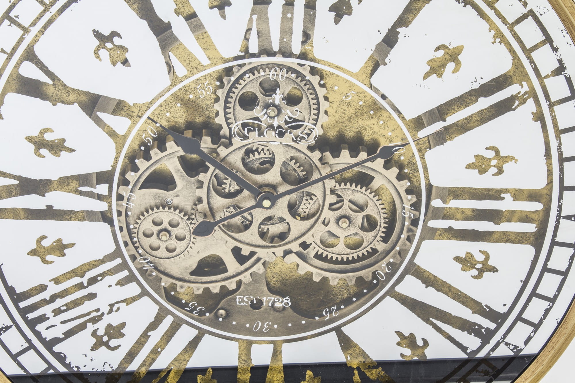 Wykonany z metalu wielokolorowy. Czarno-złote wskazówki na tarczy. Obudowa jest masywna, gruba, wykończona złota obwódką.
