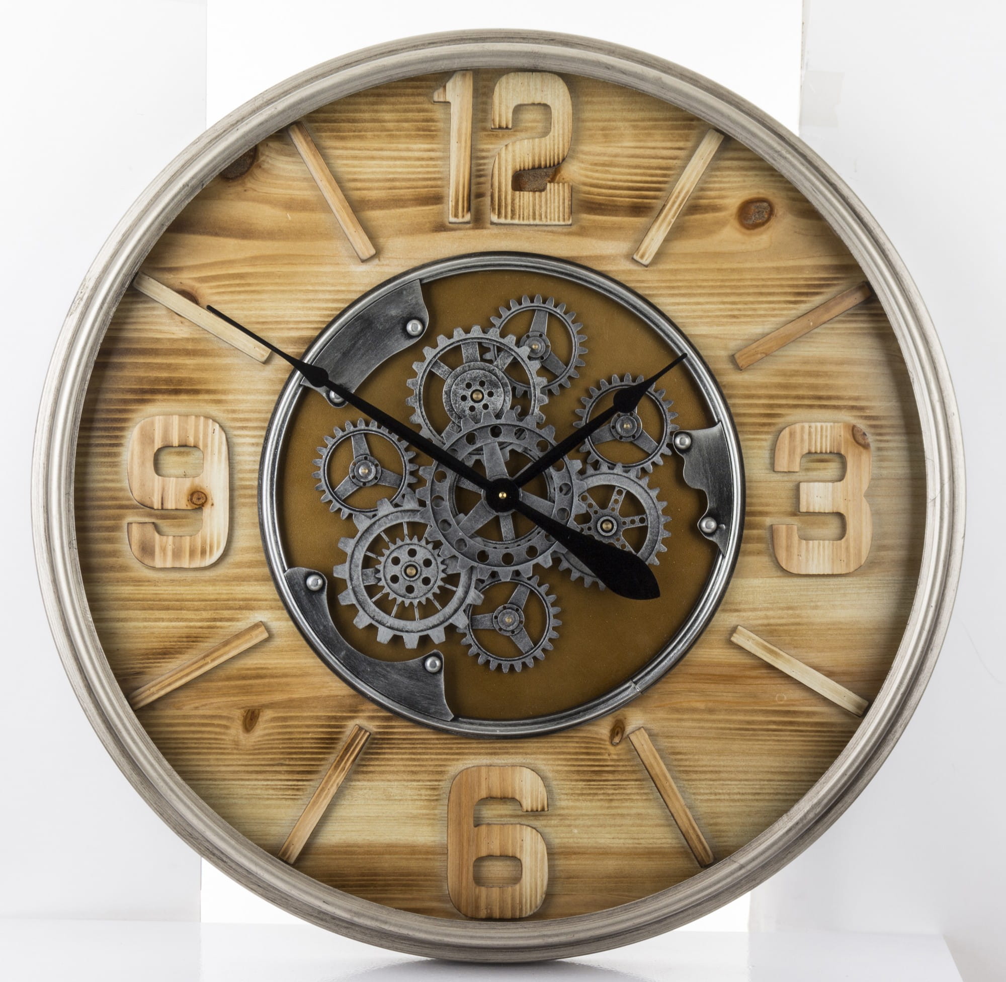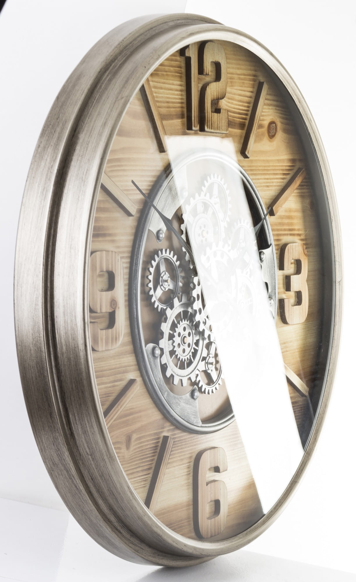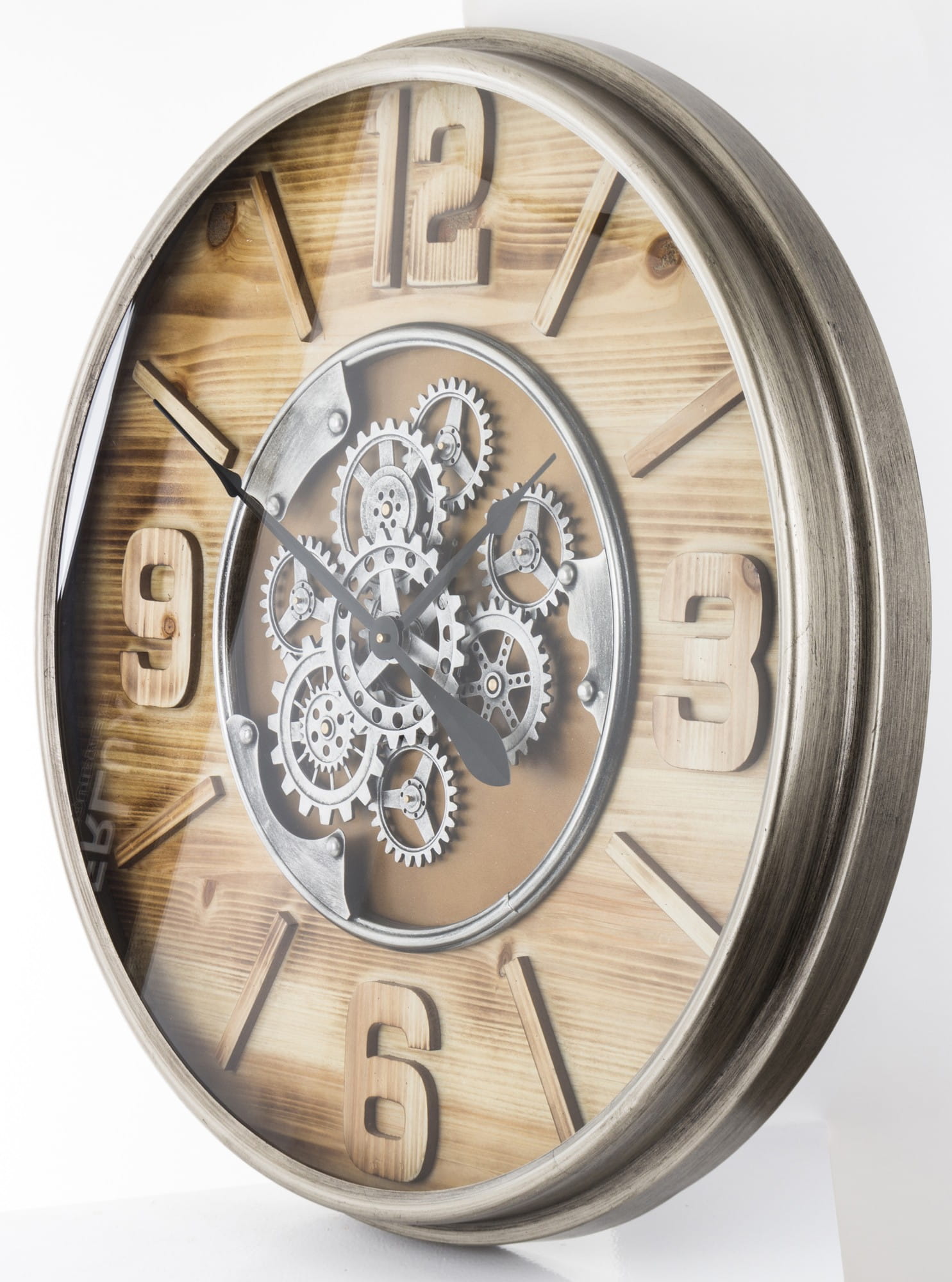 Wykonany z tworzywa sztucznego i metalu w kolorze czarnym, brązowym. Czarne wskazówki na tarczy. Zegar doskonale ozdabia każde pomieszczenie nadając mu wyjątkowego charakteru, oryginalne modele z obracającym się mechanizmem (zębatkami) co na ścianie daje wspaniały efekt wizualny.