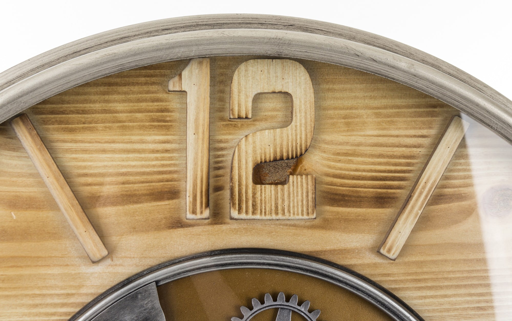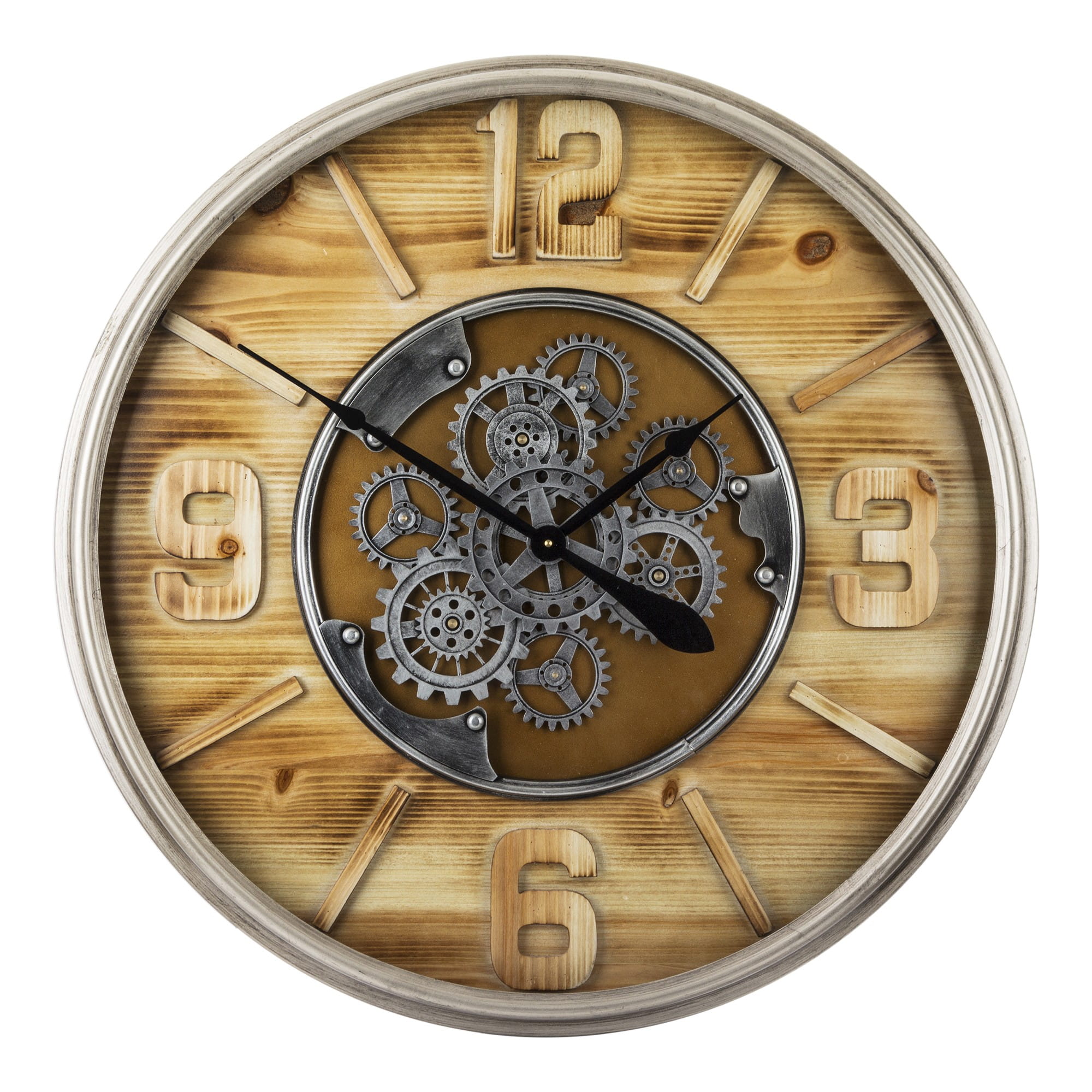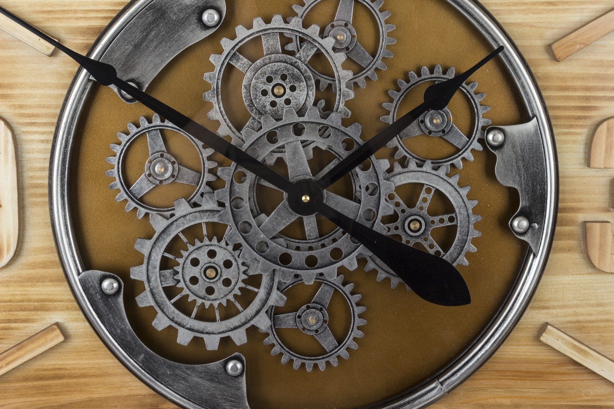 Wykonany z tworzywa sztucznego i metalu w kolorze czarnym, brązowym. Czarne wskazówki na tarczy. Zegar doskonale ozdabia każde pomieszczenie nadając mu wyjątkowego charakteru, oryginalne modele z obracającym się mechanizmem (zębatkami) co na ścianie daje wspaniały efekt wizualny.