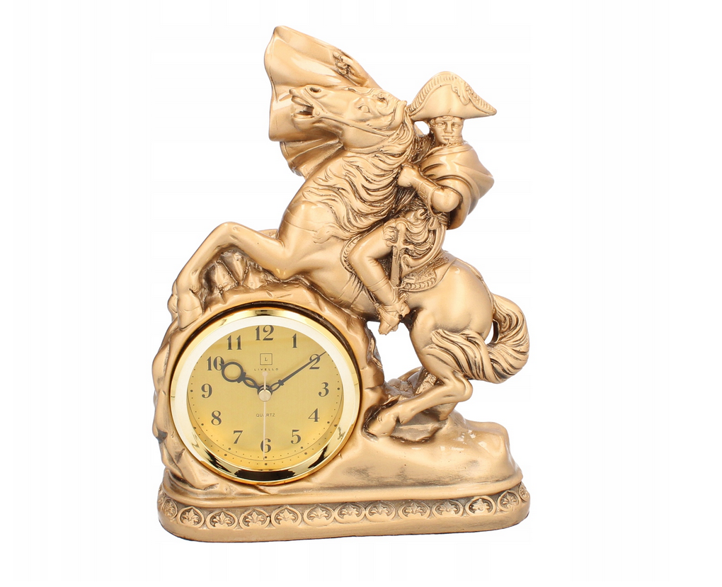 Dodaj wnętrzu wyjątkowego charakteru dzięki efektownemu zegarowi kominkowemu LIVELLO NAPOLEON. Ten stylowy model inspirowany klasyczną sztuką dekoracyjną przedstawia postać Napoleona na wspiętym koniu, tworząc niezwykle dekoracyjną i przyciągającą wzrok kompozycję. Złote wykończenie podkreśla luksusowy charakter produktu, dzięki czemu zegar doskonale sprawdzi się jako ozdoba salonu, gabinetu, kominka czy eleganckiej komody.